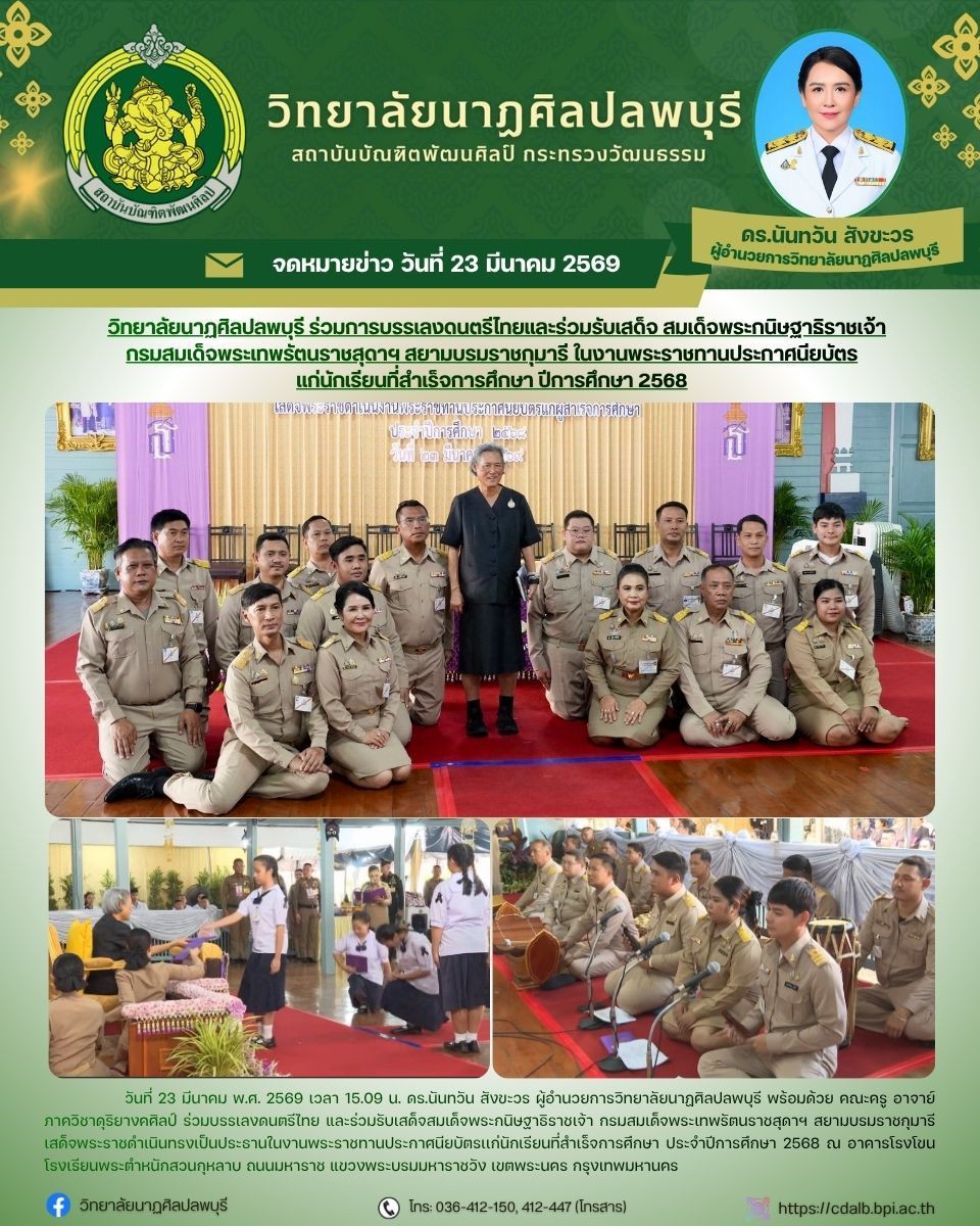 วิทยาลัยนาฏศิลปลพบุรี โดย ดร.นันทวัน สังขะวร ผู้อำนวยการ พร้อมด้วย คณะครู อาจาย์ ภาควิชาดุริยางคศิลป์ ร่วมบรรเลงดนตรีไทย และร่วมรับเสด็จ สมเด็จพระกนิษฐาธิราชเจ้า กรมสมเด็จพระเทพรัตนราชสุดาฯ สยามบรมราชกุมารี ในงานพระราชทานประกาศนียบัตรเเก่นักเรียนที่สำเร็จการศึกษา ประจำปีการศึกษา 2568 วันที่ 23 มีนาคม พ.ศ. 2569 ณ อาคารโรงโขน โรงเรียนพระตำหนักสวนกุหลาบ กรุงเทพมหานคร