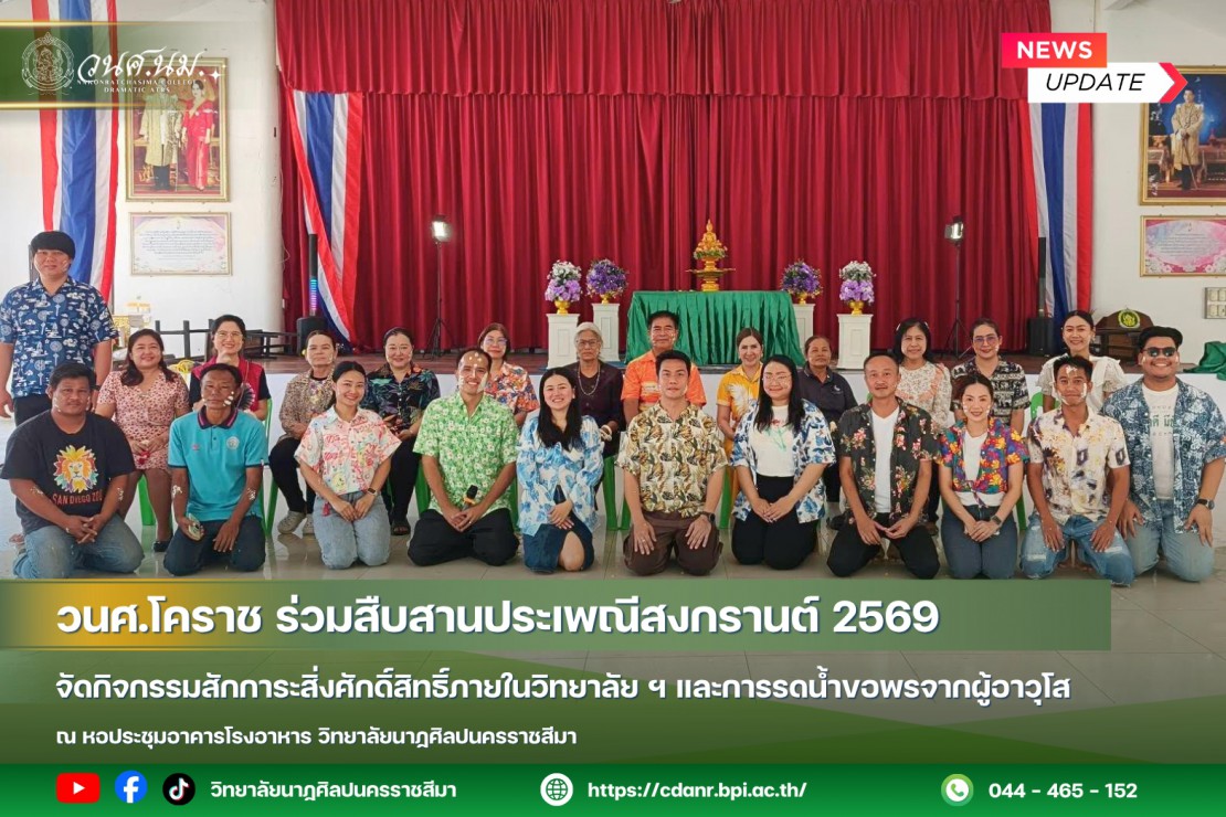 วันที่ 10 เมษายน 2569 วิทยาลัยนาฏศิลปนครราชสีมา นำโดยนายสิทธิชัย ตั้งจิตพัฒนกุล ผู้อำนวยการวิทยาลัยนาฏศิลปนครราชสีมา พร้อมด้วยคณะผู้บริหาร ครู อาจารย์ บุคลากรทางการศึกษา และเจ้าหน้าที่ ร่วมสืบสานประเพณีสงกรานต์ 2569 โดยจัดกิจกรรมสักการะสิ่งศักดิ์สิทธิ์ภายในวิทยาลัย ฯ และการรดน้ำขอพรจากผู้อาวุโส ณ หอประชุมอาคารโรงอาหาร วิทยาลัยนาฏศิลปนครราชสีมา