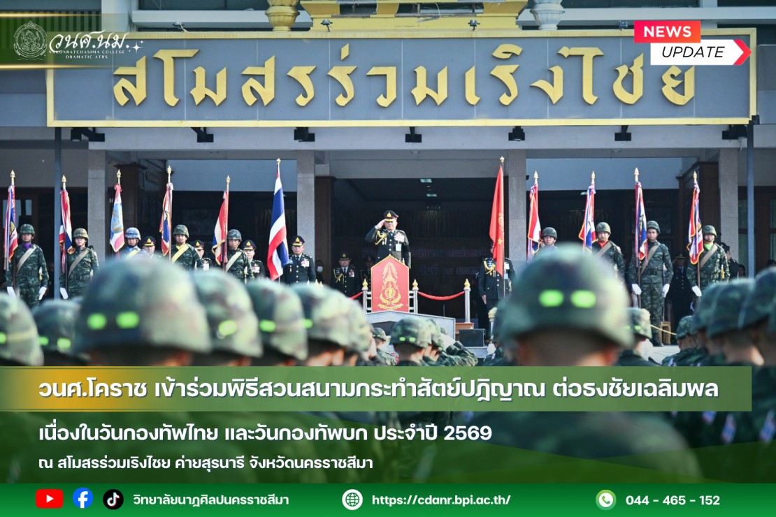 (sparkles)วันที่ 18 มกราคม 2569 นายสิทธิชัย ตั้งจิตพัฒนกุล ผู้อำนวยการวิทยาลัยนาฏศิลปนครราชสีมา มอบหมายให้นายเกียรติศักดิ์ โพศิริ รองผู้อำนวยการฝ่ายบริหาร พร้อมด้วยว่าที่ร้อยตรี สุวิชา พงษ์เกิดลาภ รองผู้อำนวยการฝ่ายกิจการนักเรียน นักศึกษา เข้าร่วมพิธีสวนสนามกระทำสัตย์ปฏิญาณ ต่อธงชัยเฉลิมพล