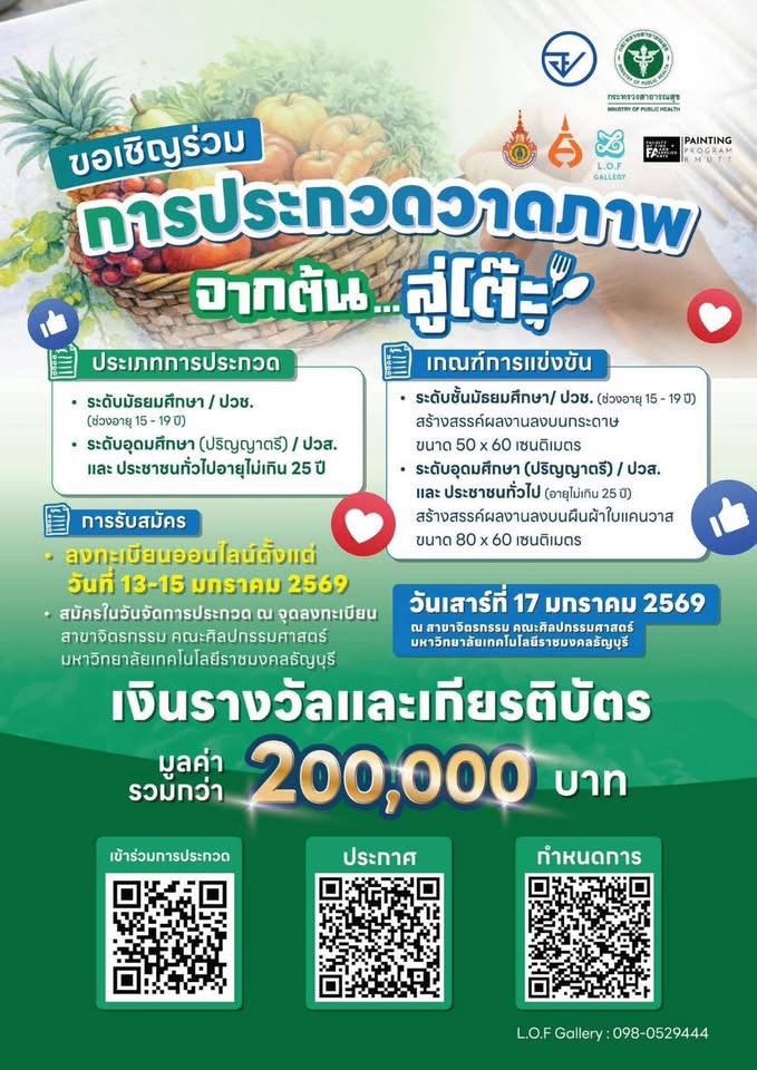 ชวนร่วมประกวดสร้างสรรค์ผลงานศิลปะ ถ่ายทอดมุมมองเรื่องอาหาร ตั้งแต่ต้นทางการปลูก จนถึงความปลอดภัยบนโต๊ะอาหาร ภายใต้แนวคิดการคุ้มครองผู้บริโภคด้านอาหารของ อย.