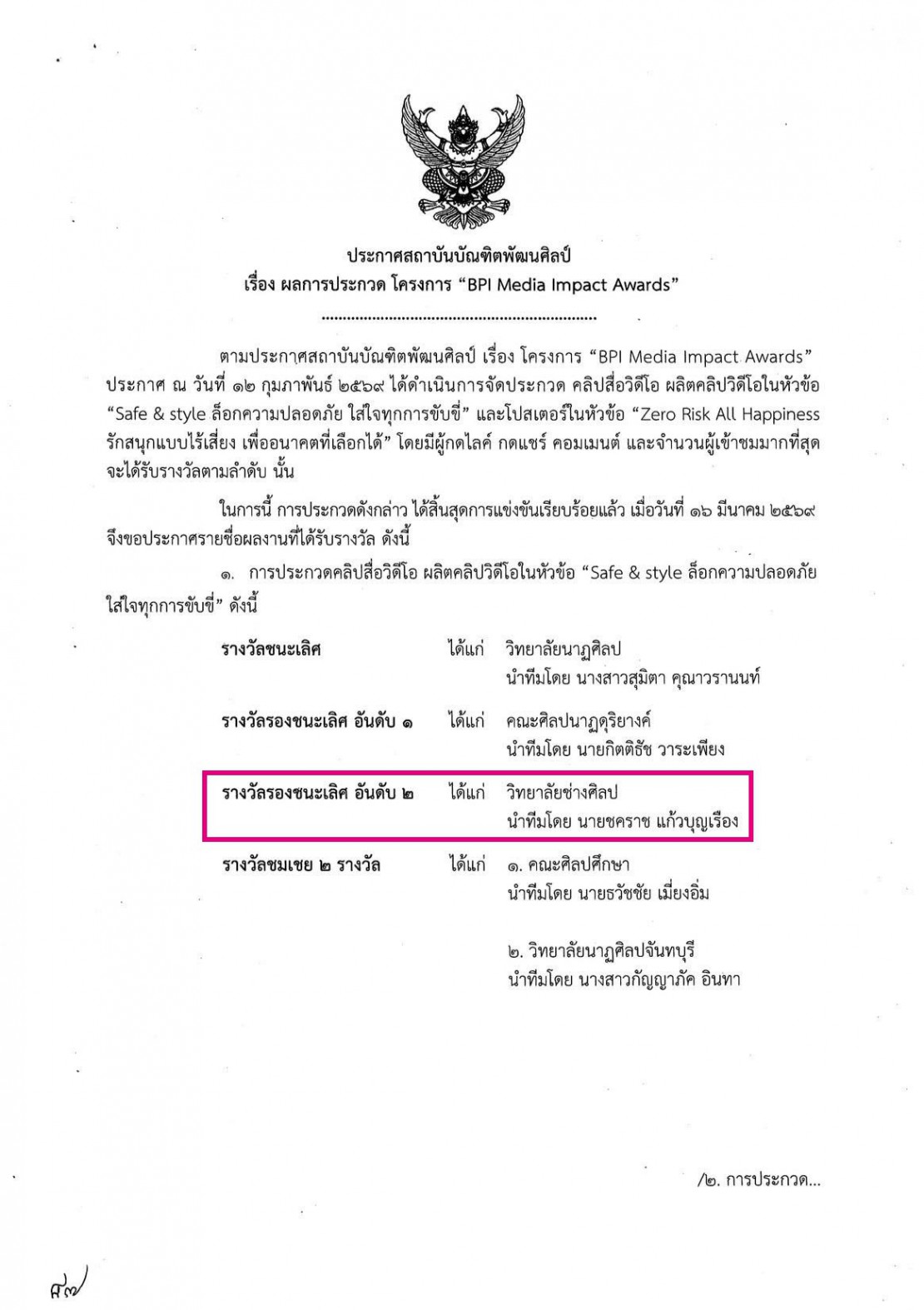 🎨 วิทยาลัยช่างศิลป สถาบันบัณฑิตพัฒนศิลป์ 🎊 ขอแสดงความยินดีกับสโมสรนักศึกษา ระดับปริญญาตรี วิทยาลัยช่างศิลป 💚 นำทีมโดย นายชคราช แก้วบุญเรือง นายกสโมสรฯ 🎉 ในโอกาสที่ได้รับรางวัลการประกวดในโครงการ “BPI Media Impact Awards” จัดโดยองค์การนักศึกษา สถาบันบัณฑิตพัฒนศิลป์ ดังนี้