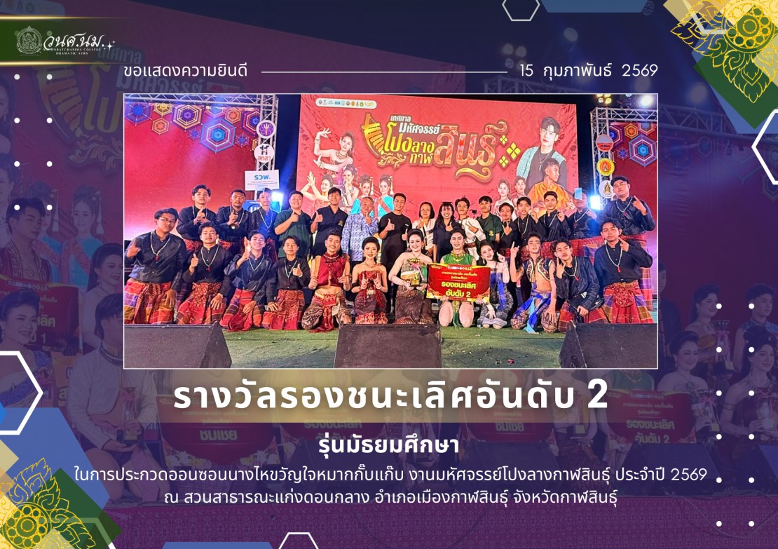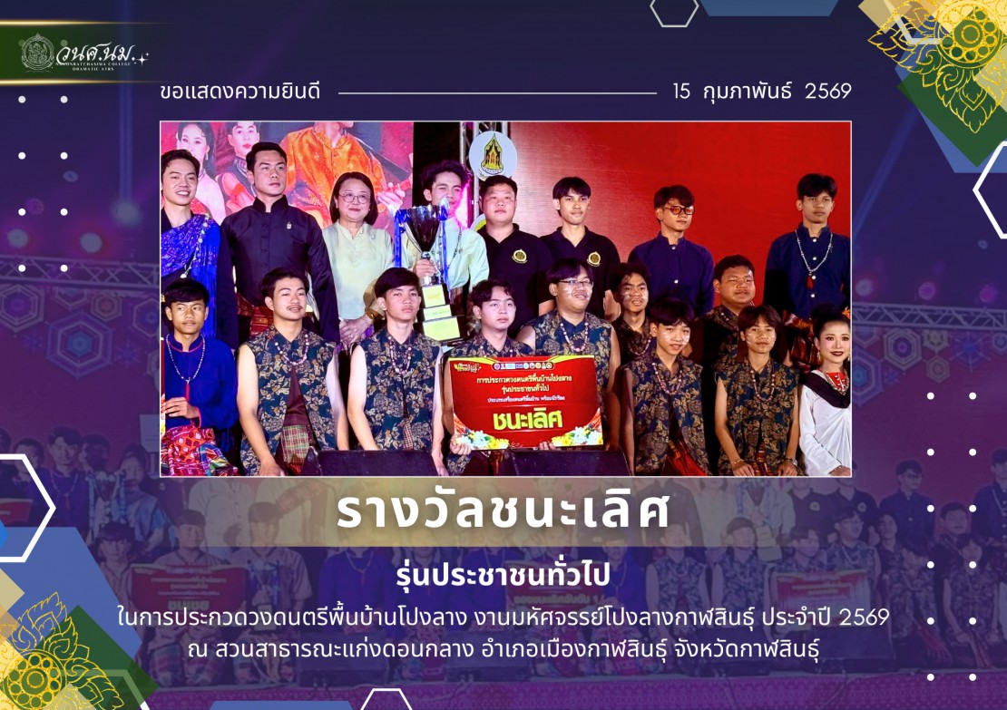 วิทยาลัยนาฏศิลปนครราชสีมา ขอแสดงความยินดีกับวงโปงลางหลานย่าโม วิทยาลัยนาฏศิลปนครราชสีมา ในงานมหัศจรรย์โปงลางกาฬสินธุ์ ประจำปี 2569