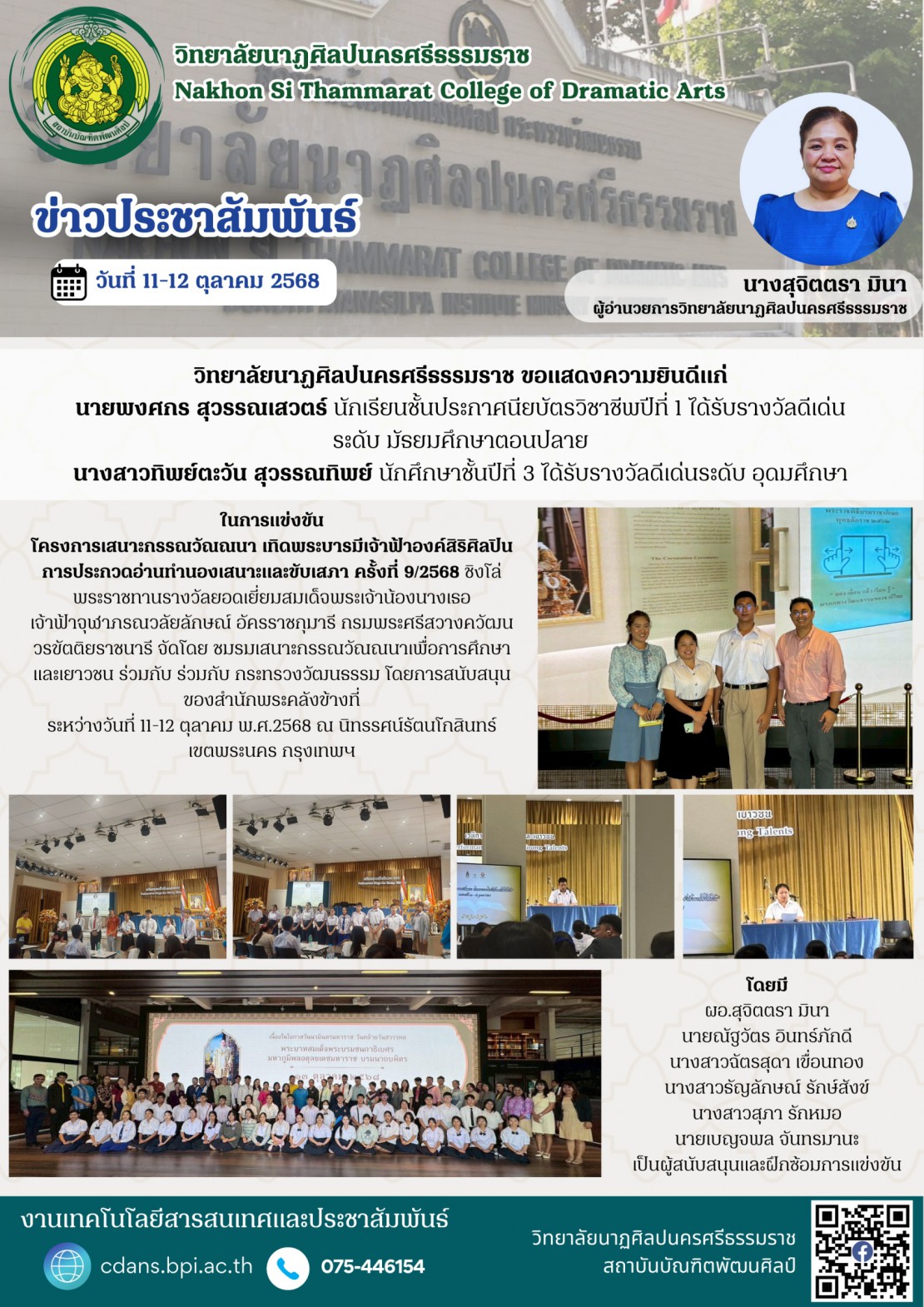 วิทยาลัยนาฏศิลปนครศรีธรรมราช แสดงความยินดีแก่นักเรียนที่ได้รับรางวัลในการเเข่งขันโครงการเสนาะกรรณวัณณนา เทิดพระบารมีเจ้าฟ้าองค์สิริศิลปิน การประกวดอ่านทำนองเสนาะและขับเสภา ครั้งที่ ๙/๒๕๖๘
