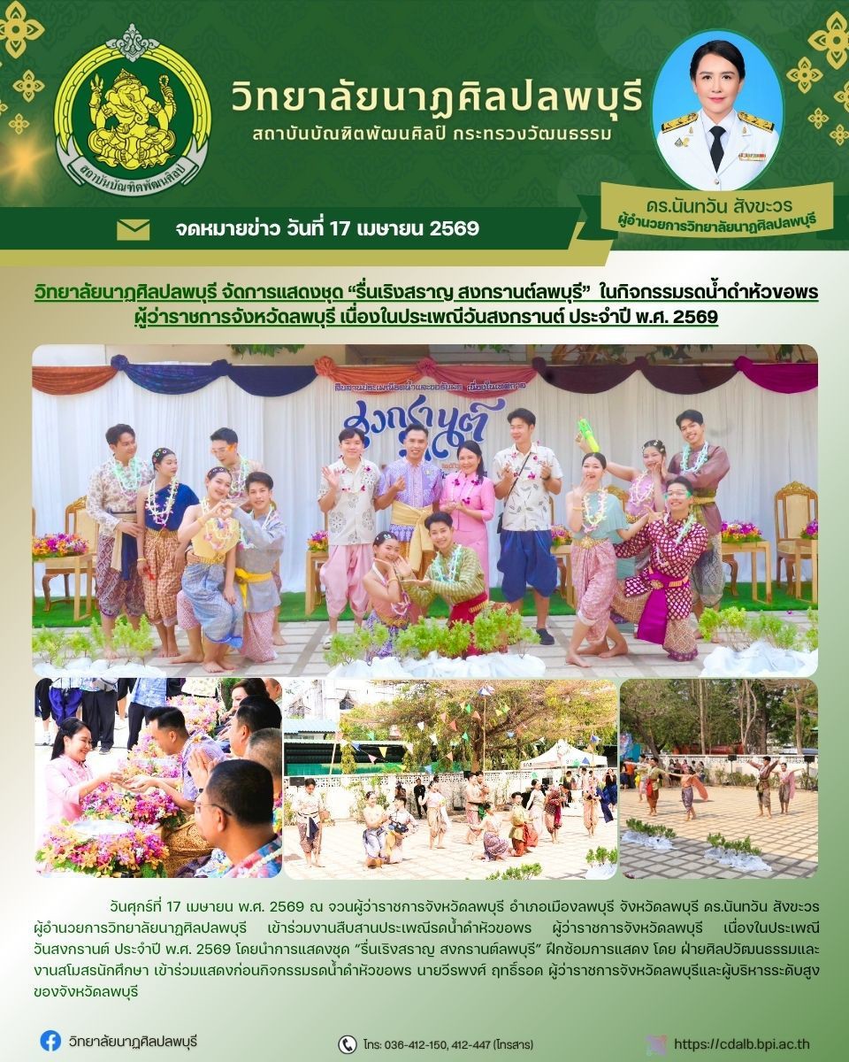 วิทยาลัยนาฏศิลปลพบุรี โดย ดร.นันทวัน สังขะวร ผู้อำนวยการ เข้าร่วมงานสืบสานประเพณีรดน้ำดำหัวขอพร เนื่องในประเพณีวันสงกรานต์ ประจำปี พ.ศ. 2569 โดยนำการแสดงชุด “รื่นเริงสราญ สงกรานต์ลพบุรี” ในกิจกรรมรดน้ำดำหัวและขอพร นายวีรพงศ์ ฤทธิ์รอด ผู้ว่าราชการจังหวัดลพบุรี และผู้บริหารระดับสูงของจังหวัดลพบุรี วันที่ 17 เมษายน พ.ศ. 2569 ณ จวนผู้ว่าราชการจังหวัดลพบุรี อำเภอเมืองลพบุรี จังหวัดลพบุรี