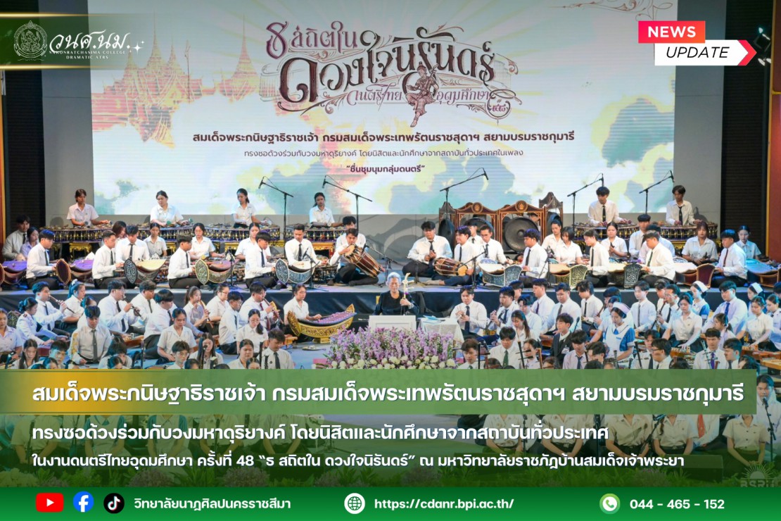 (sparkles)วันที่ 22 - 25 กุมภาพันธ์ 2569 สมเด็จพระกนิษฐาธิราชเจ้า กรมสมเด็จพระเทพรัตนราชสุดาฯ สยามบรมราชกุมารี ทรงซอด้วงร่วมกับวงมหาดุริยางค์ โดยนิสิตและนักศึกษาจากสถาบันทั่วประเทศ นายสิทธิชัย ตั้งจิตพัฒนกุล ผู้อำนวยการวิทยาลัยนาฏศิลปนครราชสีมา นำตัวแทนนักศึกษา สาขาวิชาดนตรีศึกษา ร่วมบรรเลง เนื่องในงานดนตรีไทยอุดมศึกษา ครั้งที่ 48 “ธ สถิตใน ดวงใจนิรันดร์” ณ มหาวิทยาลัยราชภัฏบ้านสมเด็จเจ้าพระยา