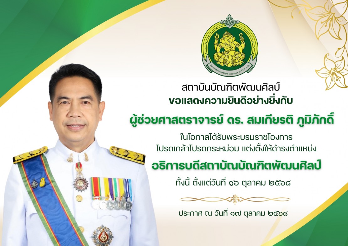 สถาบันบัณฑิตพัฒนศิลป์ ขอแสดงความยินดีอย่างยิ่งกับ ผู้ช่วยศาสตราจารย์ ดร.สมเกียรติ ภูมิภักดิ์  ในโอกาสที่ได้รับพระบรมราชโองการโปรดเกล้าโปรดกระหม่อม แต่งตั้งให้ดำรงตำแหน่งอธิการบดีสถาบันบัณฑิตพัฒนศิลป์