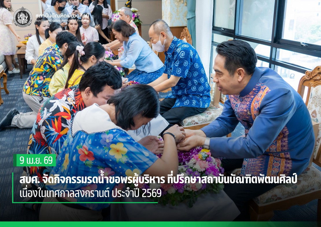 วันนี้ (9 เมษายน 2569) เวลา 11.30 น. สถาบันบัณฑิตพัฒนศิลป์ จัดกิจกรรม รดน้ำขอพรผู้บริหาร ที่ปรึกษาสถาบันบัณฑิตพัฒนศิลป์ เนื่องในเทศกาลสงกรานต์ ประจำปี 2569 โดยมี ผู้ช่วยศาสตราจารย์ ดร.สมเกียรติ ภูมิภักดิ์ อธิการบดี เป็นประธานในพิธี พร้อมด้วย ที่ปรึกษาอธิการบดีสถาบันบัณฑิตพัฒนศิลป์ ดร.นิภา โสภาสัมฤทธิ์ นายสัจจา วงศาโรจน์ นายวัชรินทร์ อ่าวสินธุ์ศิริ ร่วมอวยพรเนื่องในเทศกาลสงกรานต์ให้แก่ คณะผู้บริหาร คณาจารย์และบุคลากร สำนักงานอธิการบดี คณะศิลปนาฏดุริยางค์ คณะศิลปวิจิตร คณะศิลปศึกษา และวิทยาลัยนาฏศิลป ที่เข้าร่วม ณ ห้องประชุมมหาสุรสิงหนาท ชั้น 5 สำนักงานอธิการบดี สถาบันบัณฑิตพัฒนศิลป์ (ศาลายา)