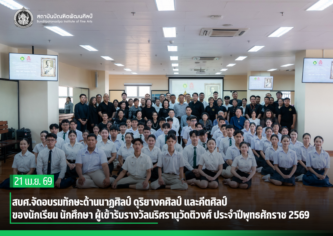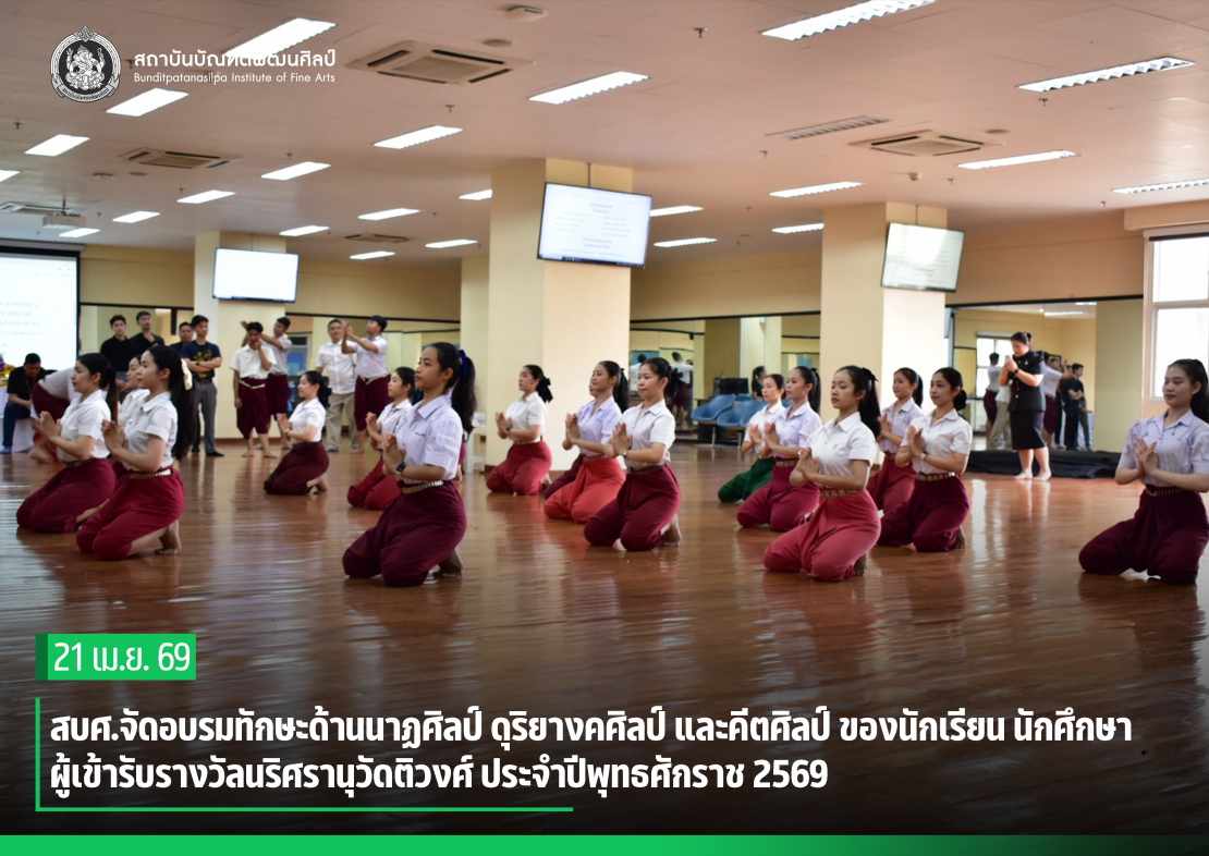 สถาบันบัณฑิตพัฒนศิลป์จัดอบรมทักษะด้านนาฏศิลป์ ดุริยางคศิลป์ และคีตศิลป์ ของนักเรียน นักศึกษา ผู้เข้ารับรางวัลนริศรานุวัดติวงศ์ ประจำปีพุทธศักราช 2569 เพื่อเปิดโอกาสให้ผู้เข้าร่วมได้รับประสบการณ์ตรงในการถ่ายทอดความรู้ด้านนาฏศิลป์ ดุริยางคศิลป์ และคีตศิลป์ จากผู้เชี่ยวชาญ พัฒนาทักษะสู่ความชำนาญในแต่ละสาขา และเสริมสร้างทักษะเพิ่มเติมให้แก่ผู้ได้รับรางวัล รวมถึงการฝึกซ้อมร่วมกันเพื่อยกระดับความสามารถในการแสดงบนเวทีต่อสาธารณชน  โดยมี นักเรียน นักศึกษา ระดับประกาศนียบัตรวิชาชีพและระดับปริญญาตรี ผู้เข้ารับรางวัลนริศรานุวัดติวงศ์ ปีพุทธศักราช 2569 สาขานาฏศิลป์ ดุริยางคศิลป์ และคีตศิลป์ เข้าร่วม จำนวน 52 คน (สถาบันบัณฑิตพัฒนศิลป์และวิทยาลัยในสังกัด 48 คน จุฬาลงกรณ์มหาวิทยาลัย 2 คน และ มหาวิทยาลัยเทคโนโลยีราชมงคลธัญบุรี 2 คน) ระหว่างวันที่ 21 – 23 เมษายน 2569 ณ อาคารคณะศิลปศึกษา สถาบันบัณฑิตพัฒนศิลป์ (ศาลายา)