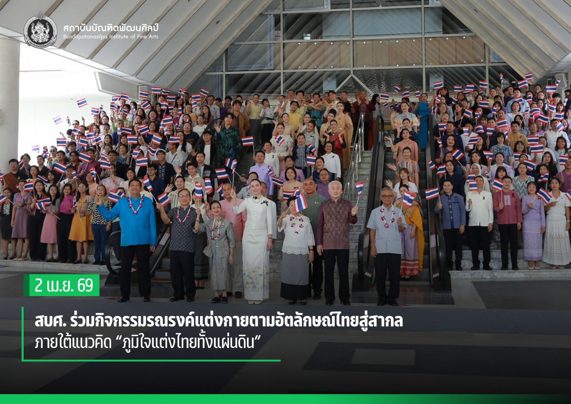 วันนี้ ( 2 เมษายน 2569) เวลา 11.30 น. ดร.สมภพ เขียวมณี รองอธิการบดีสถาบันบัณฑิตพัฒนศิลป์ พร้อมด้วยบุคลากรสำนักงานอธิการบดี ร่วมถ่ายภาพและคลิปวิดีโอ กิจกรรมรณรงค์แต่งกายตามอัตลักษณ์ไทยสู่สากล ภายใต้แนวคิด “ภูมิใจแต่งไทยทั้งแผ่นดิน” โดยมี นางสาวซาบีดา ไทยเศรษฐ์ รัฐมนตรีว่าการกระทรวงวัฒนธรรม เป็นประธานในพิธี พร้อมด้วย นายประสพ เรียงเงิน ผู้บริหารกระทรวงวัฒนธรรม และบุคลากรกระทรวงวัฒนธรรม ณ บริเวณด้านหน้าอาคารหอศิลป์แห่งชาติ กระทรวงวัฒนธรรม