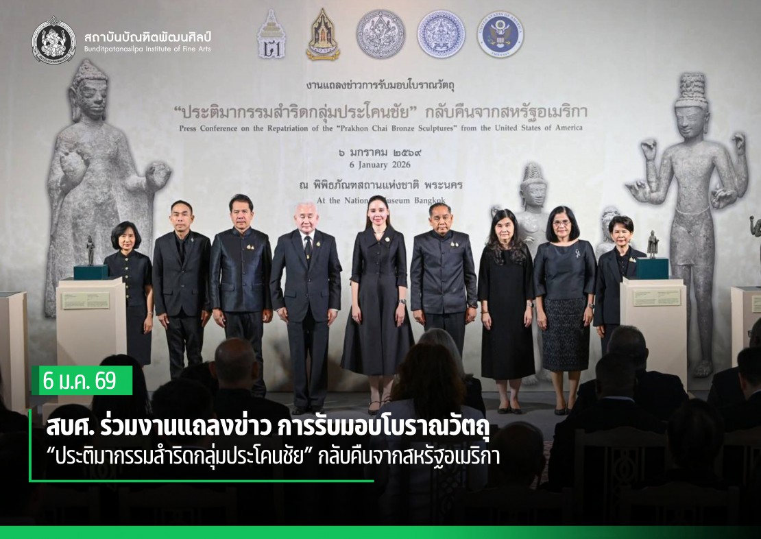 อธิการบดีสถาบันบัณฑิตพัฒนศิลป์ มอบหมายให้ นายภัทรชัย พ่วงแผน ผู้อำนวยการสำนักงานอธิการบดี เข้าร่วมงานแถลงข่าวการรับมอบโบราณวัตถุ “ประติมากรรมสำริดกลุ่มประโคนชัย” กลับคืนจากสหรัฐอเมริกา โดยมี นางสาวซาบีดา ไทยเศรษฐ์ รัฐมนตรีว่าการกระทรวงวัฒนธรรม เป็นประธาน เมื่อวันที่ 6 มกราคม 2569 ณ พระที่นั่งอิศราวินิจฉัย พิพิธภัณฑสถานแห่งชาติ พระนคร กรุงเทพมหานคร
