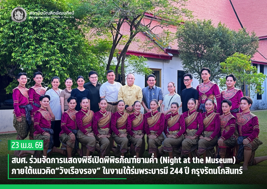กระทรวงวัฒนธรรมจัดพิธีเปิดพิพิธภัณฑ์ยามค่ำ (Night at the Museum) ภายใต้แนวคิด “วังเรืองรอง” ณ พิพิธภัณฑสถานแห่งชาติ พระนคร ในงานใต้ร่มพระบารมี 244 ปี กรุงรัตนโกสินทร์ โดยมี นายประสพ เรียงเงิน ปลัดกระทรวงวัฒนธรรม เป็นประธานในพิธี พร้อมด้วย ผู้บริหารกระทรวงวัฒนธรรม ผู้แทนจากหน่วยงานทุกภาคส่วน สื่อมวลชน และประชาชน เข้าร่วม เมื่อวันที่ 23 เมษายน 2569 ณ พิพิธภัณฑสถานแห่งชาติ พระนคร กรุงเทพมหานคร โอกาสนี้ อธิการบดีสถาบันบัณฑิตพัฒนศิลป์ มอบหมายให้ ผู้ช่วยศาสตราจารย์ ดร.พหลยุทธ กนิษฐบุตร รองอธิการบดี เข้าร่วมพิธี พร้อมทั้งนำการแสดงชุด รัตนโกสินทร์เรืองรอง นาฏ ณ วัง จากคณะศิลปนาฏดุริยางค์ ร่วมแสดงในพิธีเปิดดังกล่าวนี้ด้วย