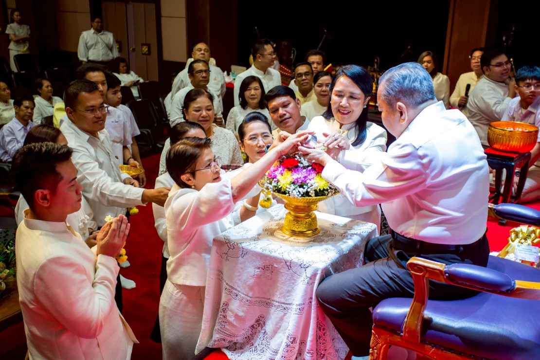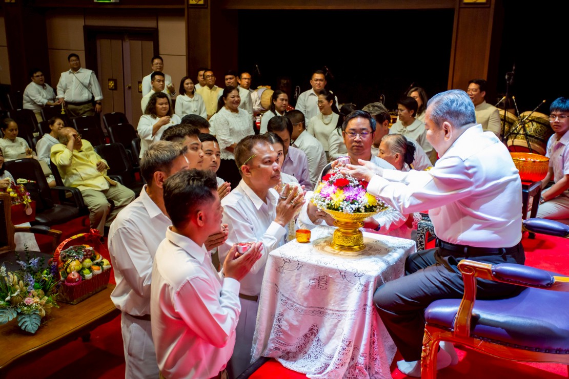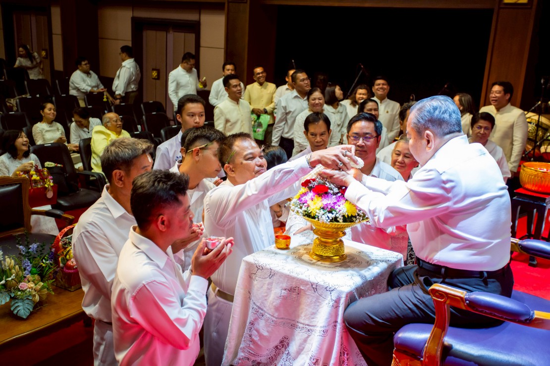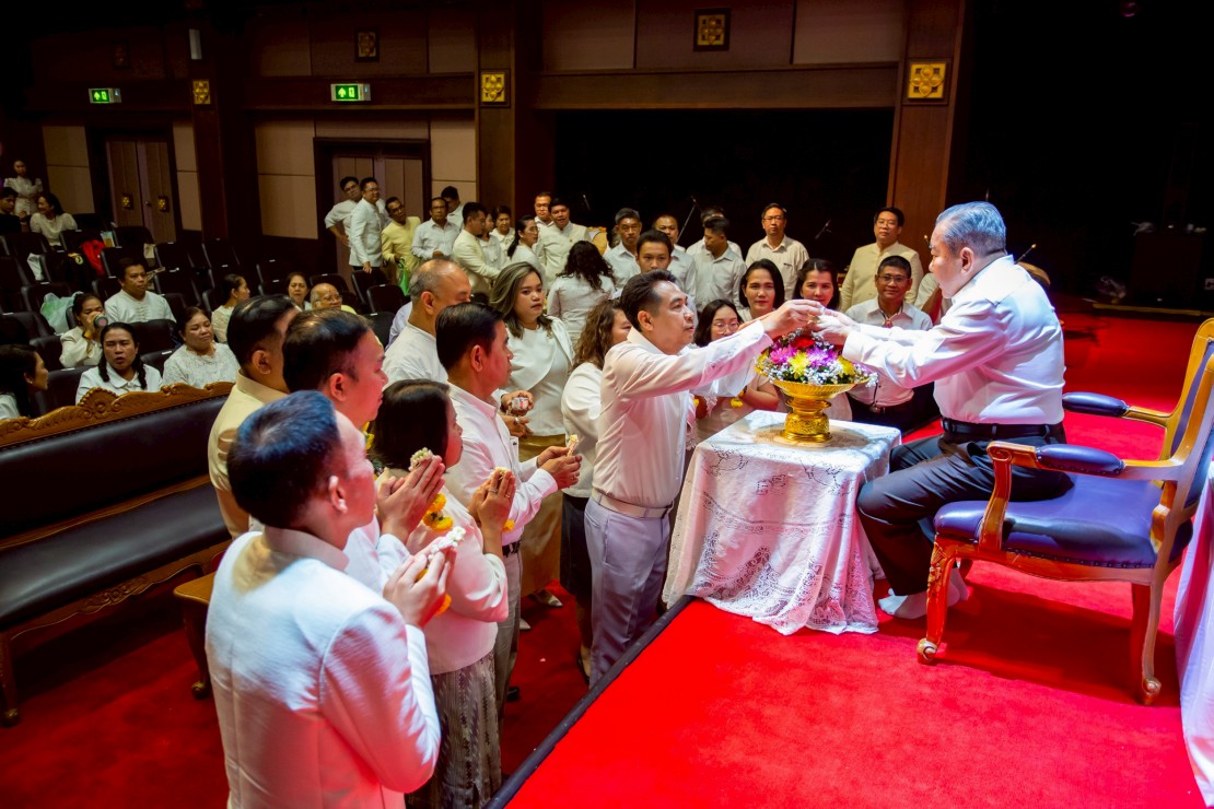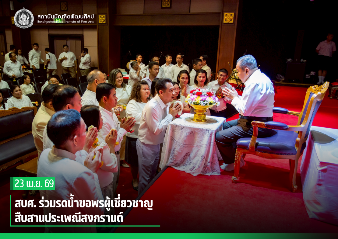 ผู้ช่วยศาสตราจารย์ ดร.สมเกียรติ ภูมิภักดิ์ อธิการบดีสถาบันบัณฑิตพัฒนศิลป์ นำคณะผู้บริหาร คณาจารย์ และบุคลากร ร่วมพิธีรดน้ำขอพร ดร.สิริชัยชาญ ฟักจำรูญ ศิลปินแห่งชาติ สาขาศิลปะการแสดง (ดนตรีไทย) พุทธศักราช ๒๕๕๗ และผู้เชี่ยวชาญด้านดนตรีไทย เนื่องในโอกาสเทศกาลสงกรานต์ ประจำปี 2569 เพื่อความเป็นสิริมงคล พร้อมสืบสานประเพณีอันดีงามของไทย และแสดงถึงความเคารพกตัญญูต่อผู้ใหญ่และครูผู้ถ่ายทอดองค์ความรู้ ในวันที่ 23 เมษายน 2569 ณ โรงละครวังหน้า สถาบันบัณฑิตพัฒนศิลป์ (วังหน้า)