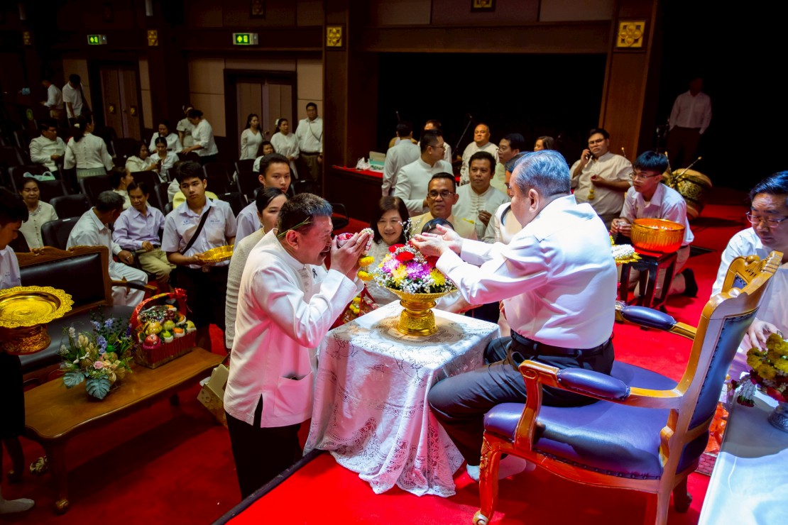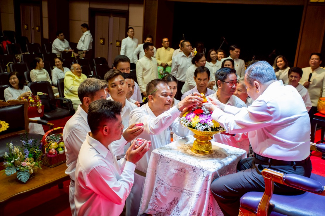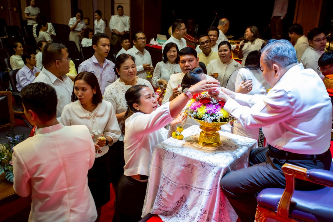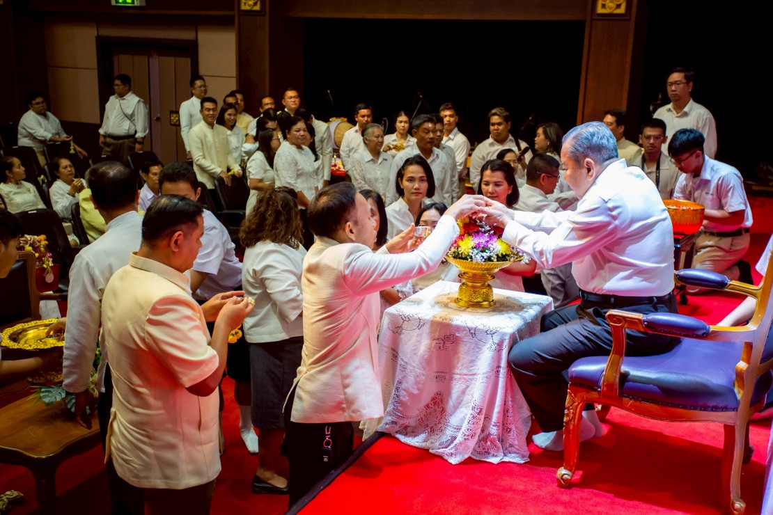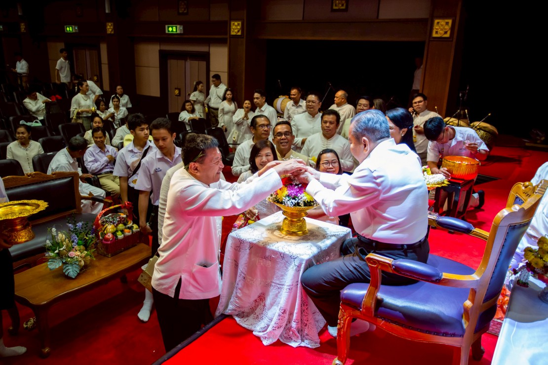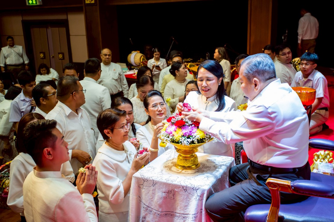 ผู้ช่วยศาสตราจารย์ ดร.สมเกียรติ ภูมิภักดิ์ อธิการบดีสถาบันบัณฑิตพัฒนศิลป์ นำคณะผู้บริหาร คณาจารย์ และบุคลากร ร่วมพิธีรดน้ำขอพร ดร.สิริชัยชาญ ฟักจำรูญ ศิลปินแห่งชาติ สาขาศิลปะการแสดง (ดนตรีไทย) พุทธศักราช ๒๕๕๗ และผู้เชี่ยวชาญด้านดนตรีไทย เนื่องในโอกาสเทศกาลสงกรานต์ ประจำปี 2569 เพื่อความเป็นสิริมงคล พร้อมสืบสานประเพณีอันดีงามของไทย และแสดงถึงความเคารพกตัญญูต่อผู้ใหญ่และครูผู้ถ่ายทอดองค์ความรู้ ในวันที่ 23 เมษายน 2569 ณ โรงละครวังหน้า สถาบันบัณฑิตพัฒนศิลป์ (วังหน้า)