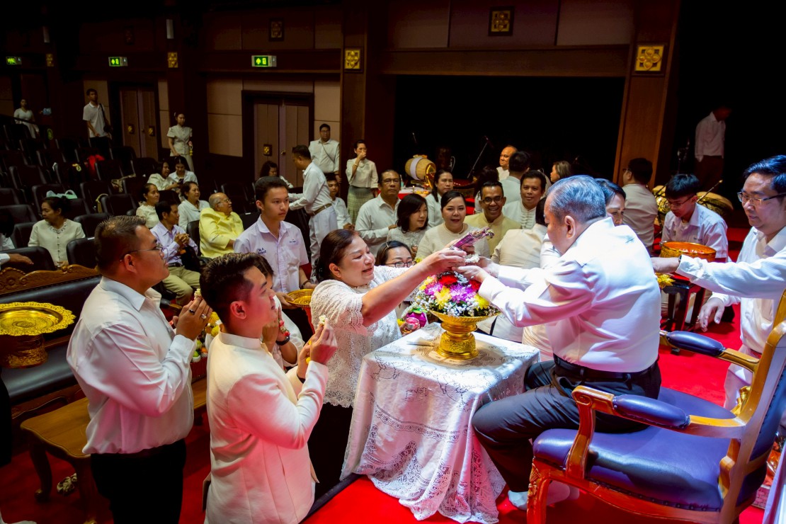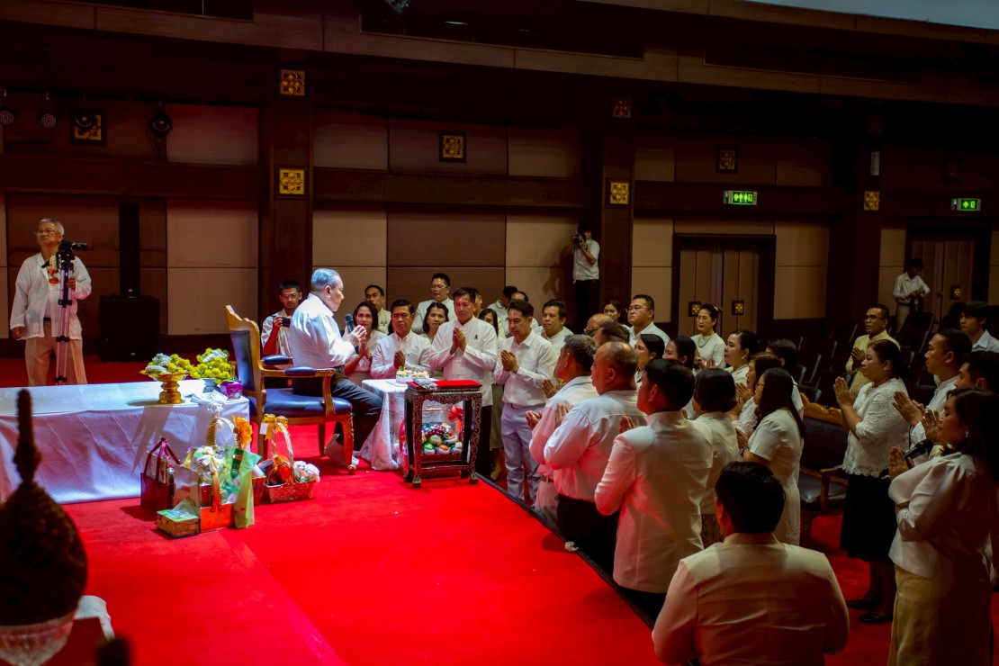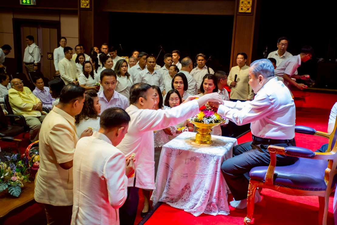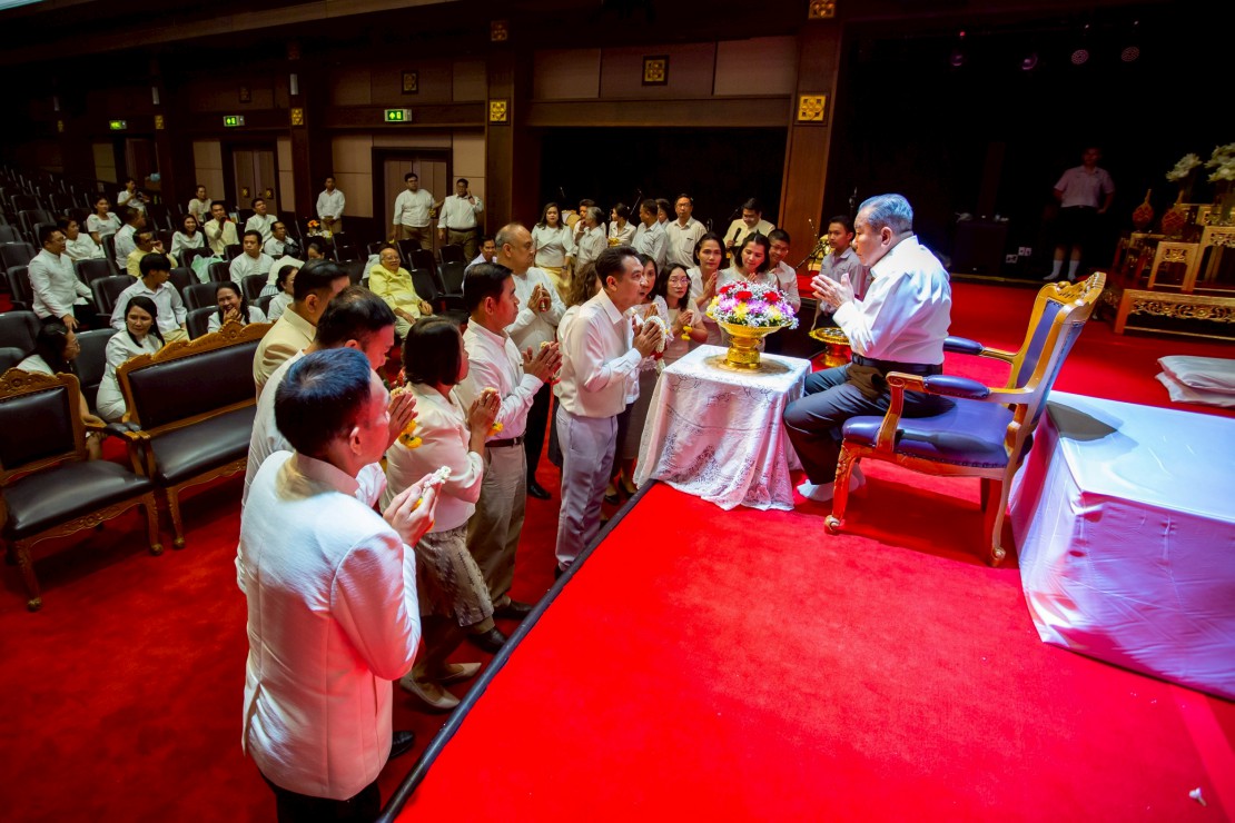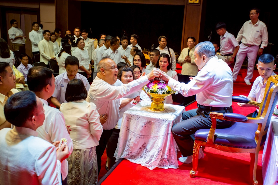 ผู้ช่วยศาสตราจารย์ ดร.สมเกียรติ ภูมิภักดิ์ อธิการบดีสถาบันบัณฑิตพัฒนศิลป์ นำคณะผู้บริหาร คณาจารย์ และบุคลากร ร่วมพิธีรดน้ำขอพร ดร.สิริชัยชาญ ฟักจำรูญ ศิลปินแห่งชาติ สาขาศิลปะการแสดง (ดนตรีไทย) พุทธศักราช ๒๕๕๗ และผู้เชี่ยวชาญด้านดนตรีไทย เนื่องในโอกาสเทศกาลสงกรานต์ ประจำปี 2569 เพื่อความเป็นสิริมงคล พร้อมสืบสานประเพณีอันดีงามของไทย และแสดงถึงความเคารพกตัญญูต่อผู้ใหญ่และครูผู้ถ่ายทอดองค์ความรู้ ในวันที่ 23 เมษายน 2569 ณ โรงละครวังหน้า สถาบันบัณฑิตพัฒนศิลป์ (วังหน้า)
