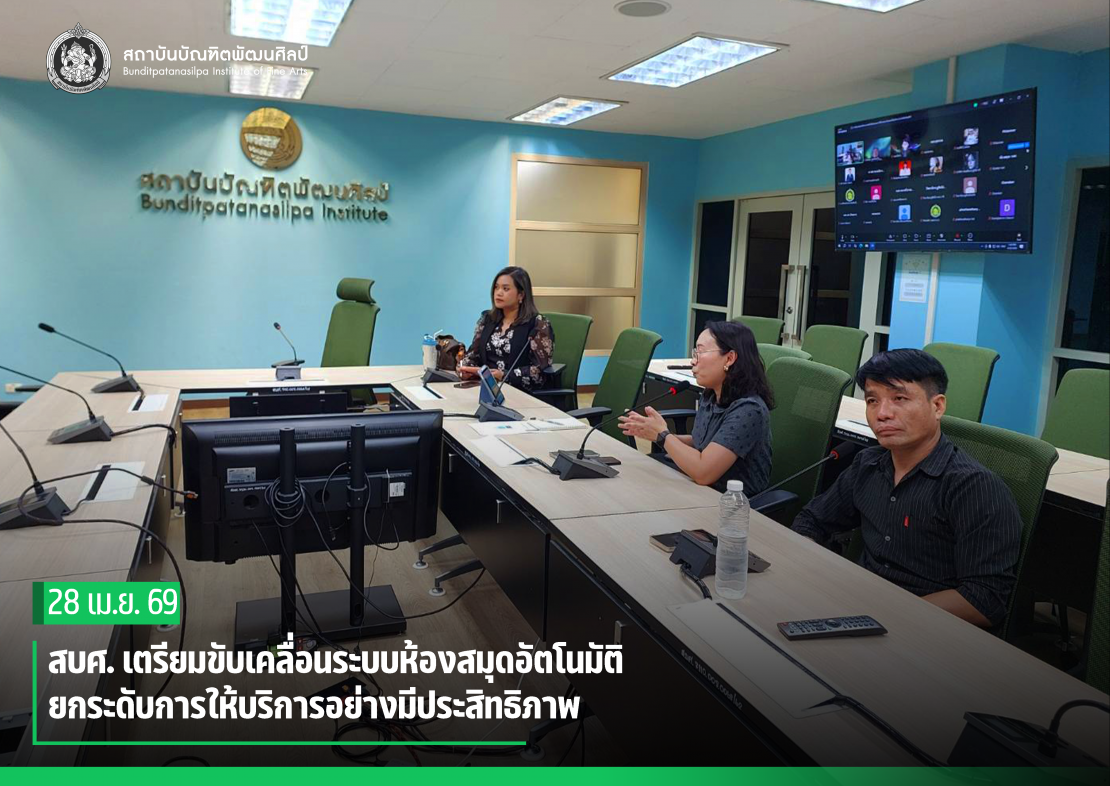วันนี้ (28 เมษายน 2569)  เวลา 13.30 น. ดร.สุชาดา โสวัตร ผู้ช่วยอธิการบดีสถาบันบัณฑิตพัฒนศิลป์ เป็นประธานการประชุมเพื่อติดตามและรับฟังข้อเสนอแนะการใช้งานระบบห้องสมุดอัตโนมัติสถาบันบัณฑิตพัฒนศิลป์โดยมี นางสาวนภานนท์ บุษบา ผู้อำนวยการกองส่งเสริมวิชาการและงานวิจัย พร้อมด้วย บุคลากรที่เกี่ยวข้องจากหน่วยงานในสังกัด เข้าร่วม ณ ห้องประชุมชั้น 4 อาคารเทคโนโลยีสารสนเทศ สถาบันบัณฑิตพัฒนศิลป์ (ศาลายา) และผ่านระบบออนไลน์ Zoom Meeting