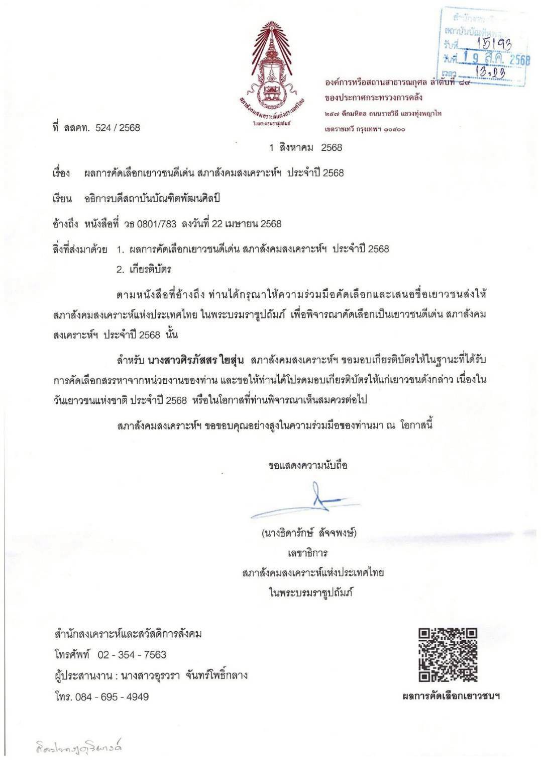 ได้รับคัดเลือกเป็น เยาวชนดีเด่น สภาสงเคราะห์ฯ ประจำปี 2568