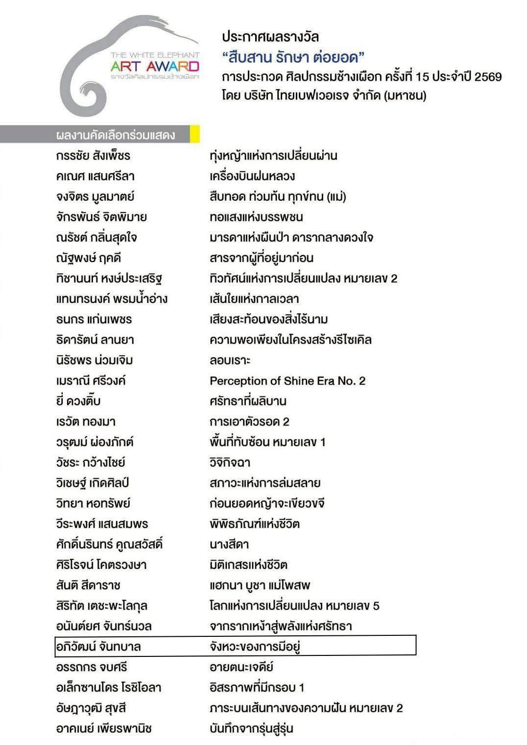 ✨️ที่ผลงานได้ผ่านการคัดเลือกให้เข้าร่วมแสดงในนิทรรศการ จากการประกวดศิลปกรรมช้างเผือก ครั้งที่ 15 ประจำปี 2569  "สืบสาน รักษา ต่อยอด" โดย บริษัท ไทยเบฟเวอเรจจำกัด (มหาชน)