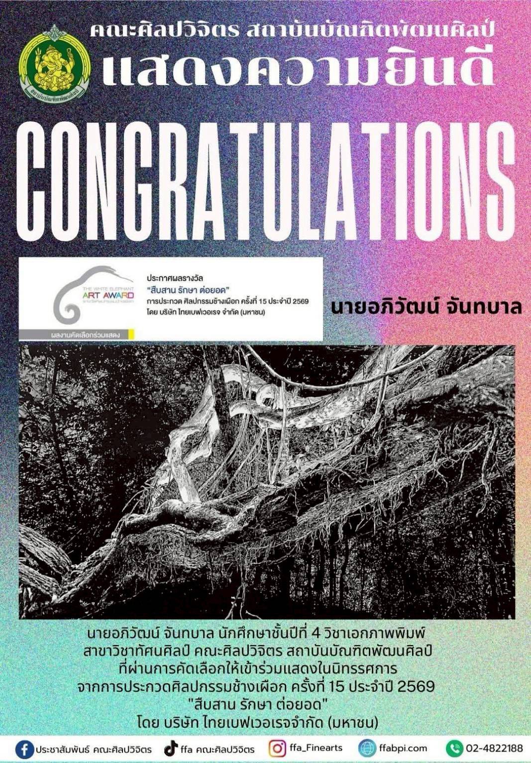 คณะศิลปวิจิตร แสดงความยินดีกับนายอภิวัฒน์ จันทบาล ผ่านการคัดเลือกให้เข้าร่วมแสดงในนิทรรศการ จากการประกวดศิลปกรรมช้างเผือก ครั้งที่ 15 ประจำปี 2569