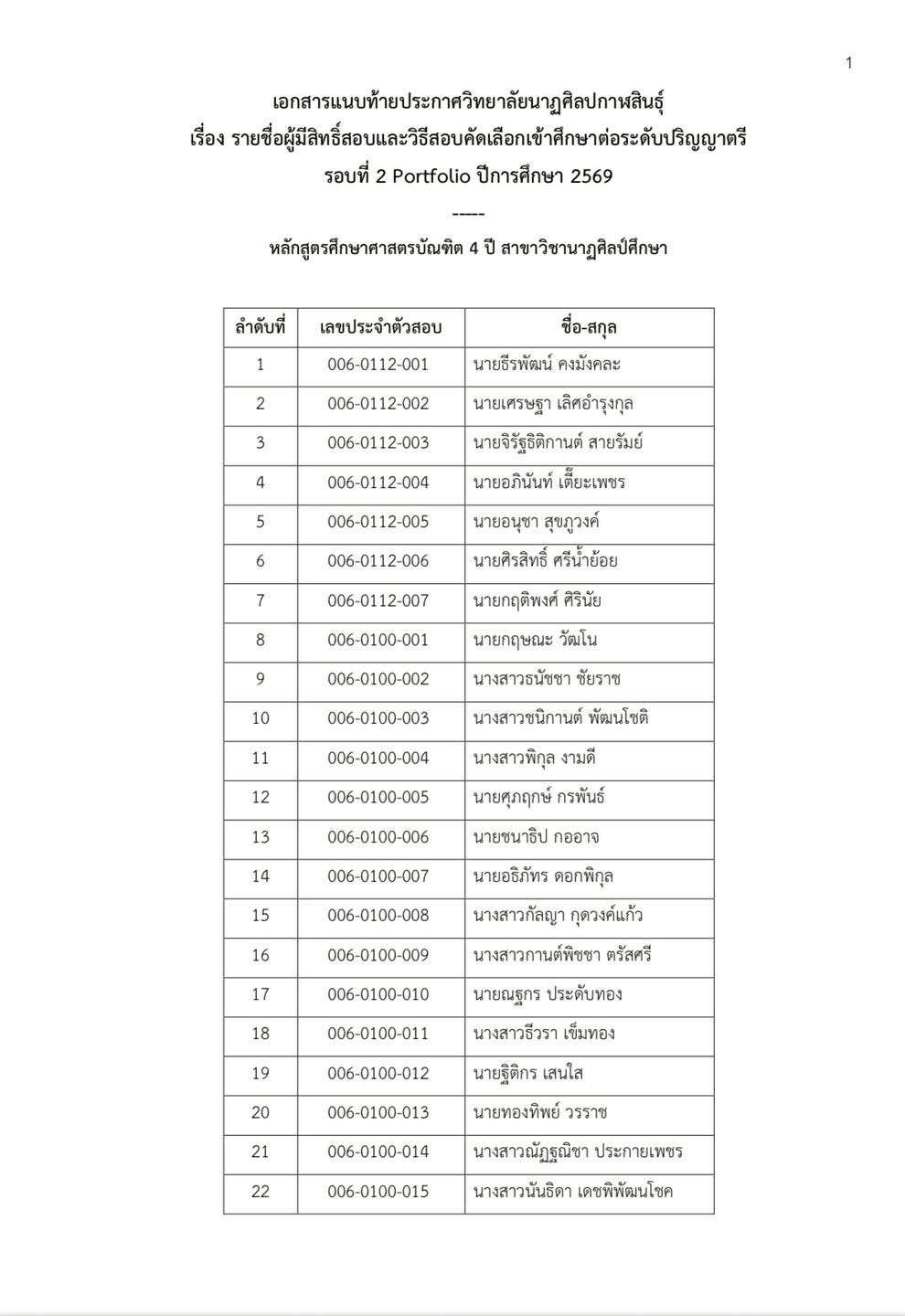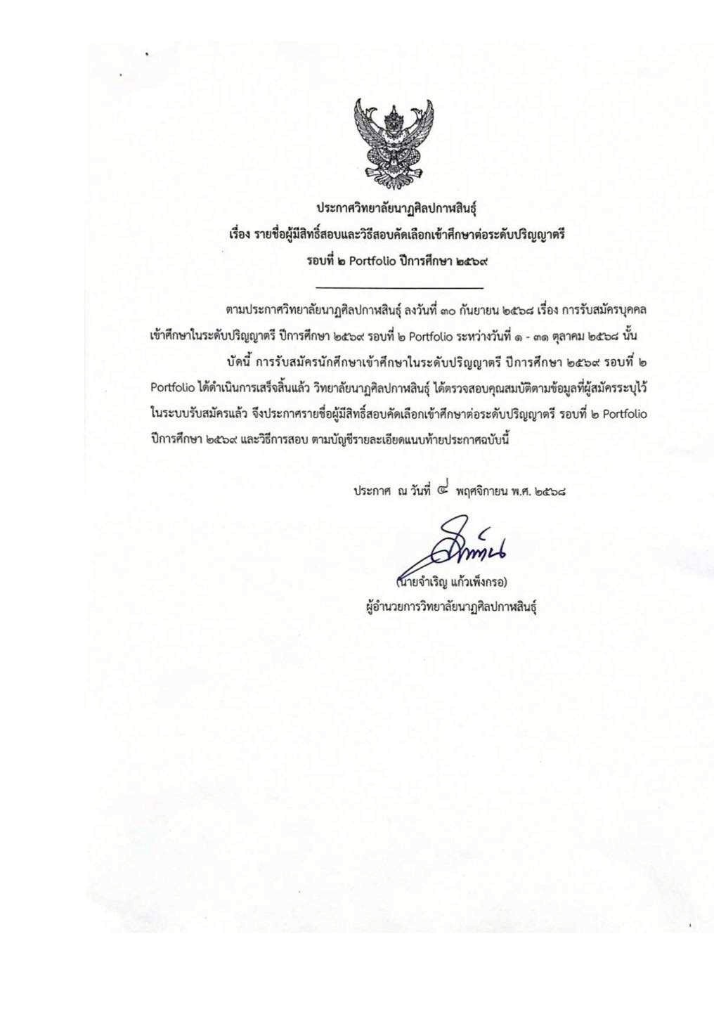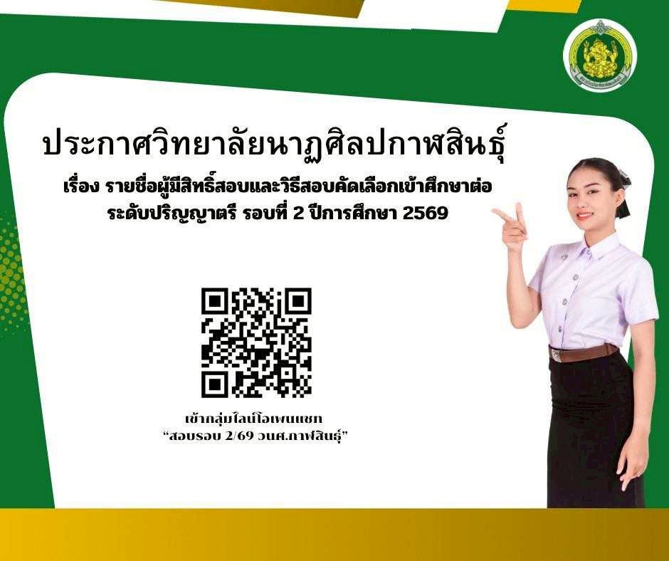 ประกาศวิทยาลัยนาฏศิลปกาฬสินธุ์ เรื่อง รายชื่อผู้มีสิทธิ์สอบและวิธีสอบคัดเลือกเข้าศึกษาต่อระดับปริญญาตรี รอบที่ 2 ปีการศึกษา 2569