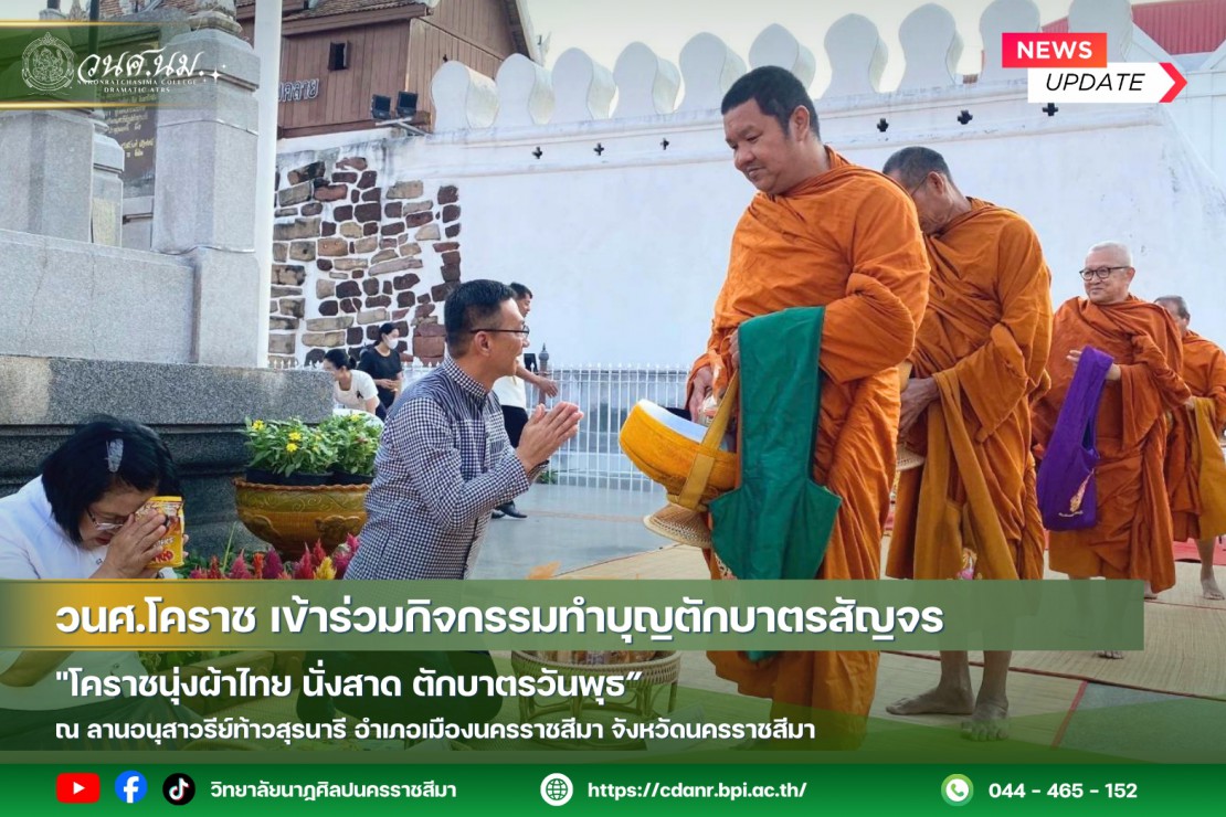 วันที่ 1 เมษายน 2569 นายสิทธิชชัย ตั้งจิตพัฒนกุล ผู้อำนวยการวิทยาลัยนาฏศิลปนครราชสีมา มอบหมายให้ว่าที่ร้อยตรีสุวิชา พงษ์เกิดลาภ รองผู้อำนวยการฝ่ายวิชาการและงานวิจัย และหัวหน้ากลุ่มพิเศษที่ 7 พร้อมด้วยนางสาวบุญจิรา เสนานิมิต นางสาวรุ่งกานต์ แซ่แต้ นายคทายุทธ์ ผาผง และนายศิวะ เอมโอด เข้าร่วมกิจกรรมทำบุญตักบาตรสัญจร "โคราชนุ่งผ้าไทย นั่งสาด ตักบาตรวันพุธ” ณ ลานอนุสาวรีย์ท้าวสุรนารี อำเภอเมืองนครราชสีมา จังหวัดนครราชสีมา โดยมีนายวิจิตร กิจวิรัตน์ รองผู้ว่าราชการจังหวัดนครราชสีมา เป็นประธานในพิธี