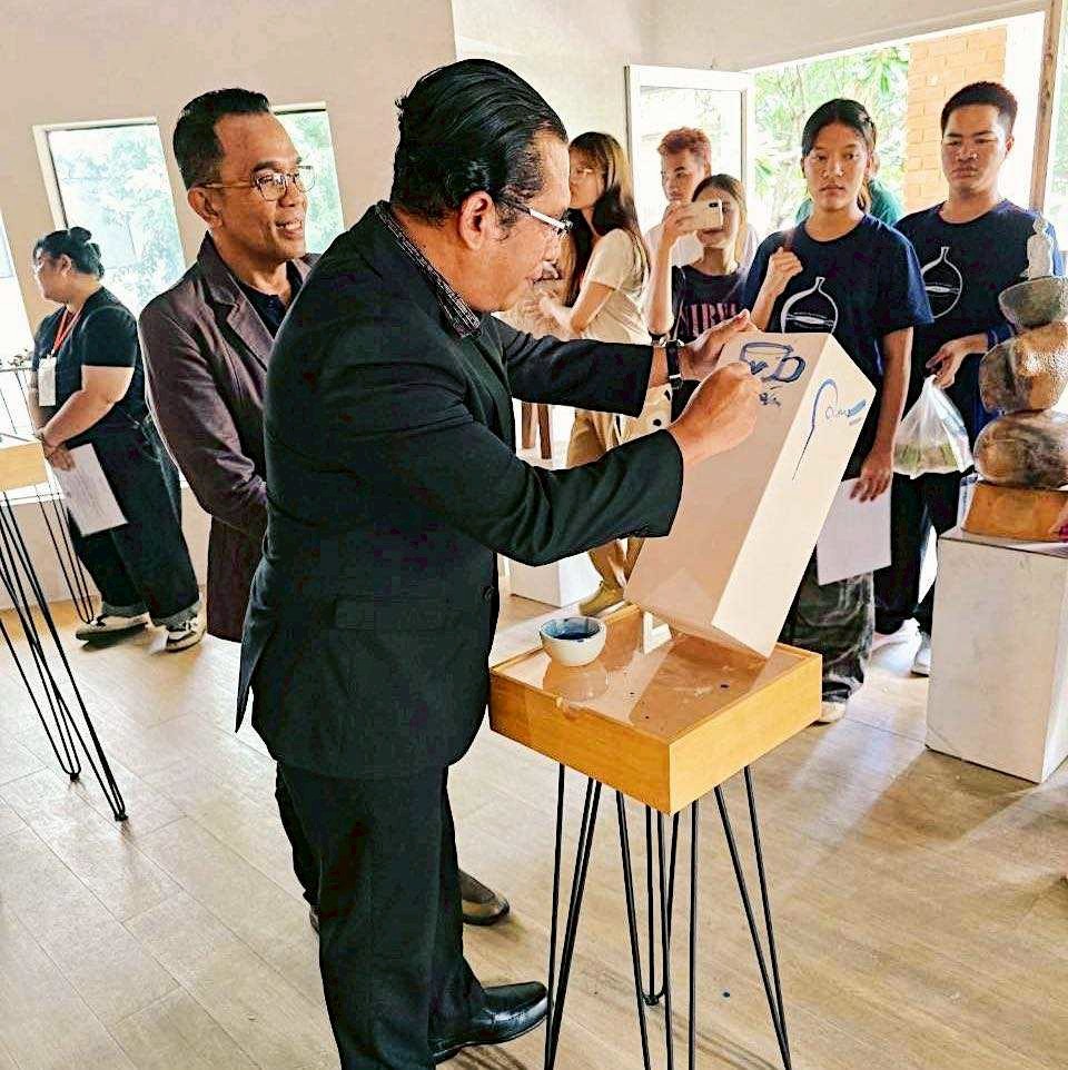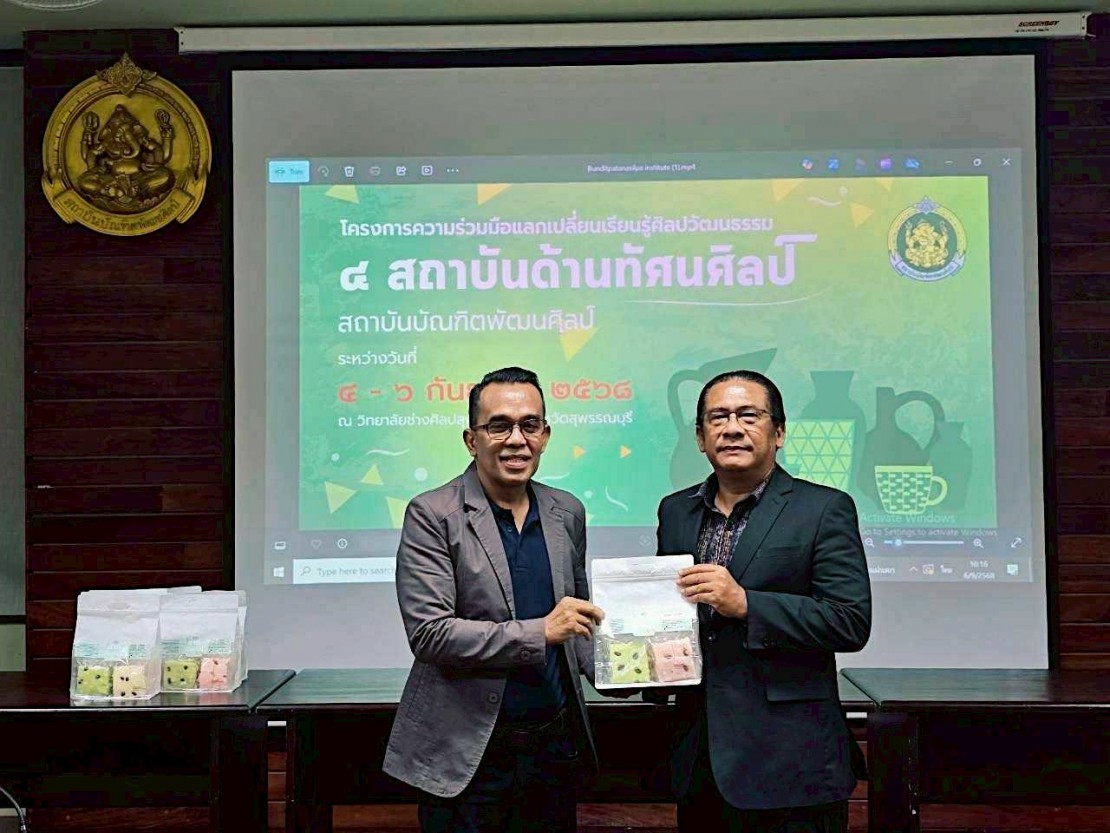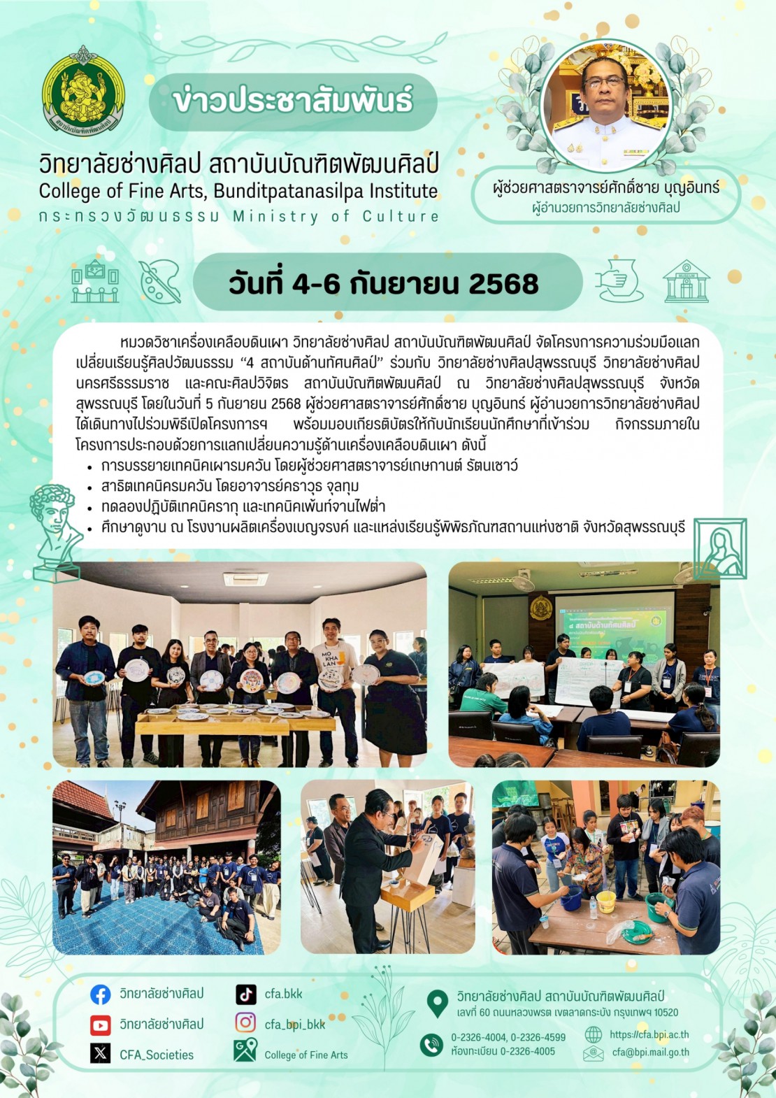 วันที่ 4-6 กันยายน 2568 หมวดวิชาเครื่องเคลือบดินเผา วิทยาลัยช่างศิลป สถาบันบัณฑิตพัฒนศิลป์  จัดโครงการความร่วมมือแลกเปลี่ยนเรียนรู้ศิลปวัฒนธรรม “4 สถาบันด้านทัศนศิลป์” ร่วมกับ วิทยาลัยช่างศิลปสุพรรณบุรี วิทยาลัยช่างศิลปนครศรีธรรมราช และคณะศิลปวิจิตร สถาบันบัณฑิตพัฒนศิลป์ ณ วิทยาลัยช่างศิลปสุพรรณบุรี จังหวัดสุพรรณบุรี  โดยในวันที่ 5 กันยายน 2568 ผู้ช่วยศาสตราจารย์ศักดิ์ชาย บุญอินทร์ ผู้อำนวยการวิทยาลัยช่างศิลป ได้เดินทางไปร่วมพิธีเปิดโครงการฯ พร้อมมอบเกียรติบัตรให้กับนักเรียนนักศึกษาที่เข้าร่วม  กิจกรรมภายในโครงการประกอบด้วยการแลกเปลี่ยนความรู้ด้านเครื่องเคลือบดินเผา ดังนี้
