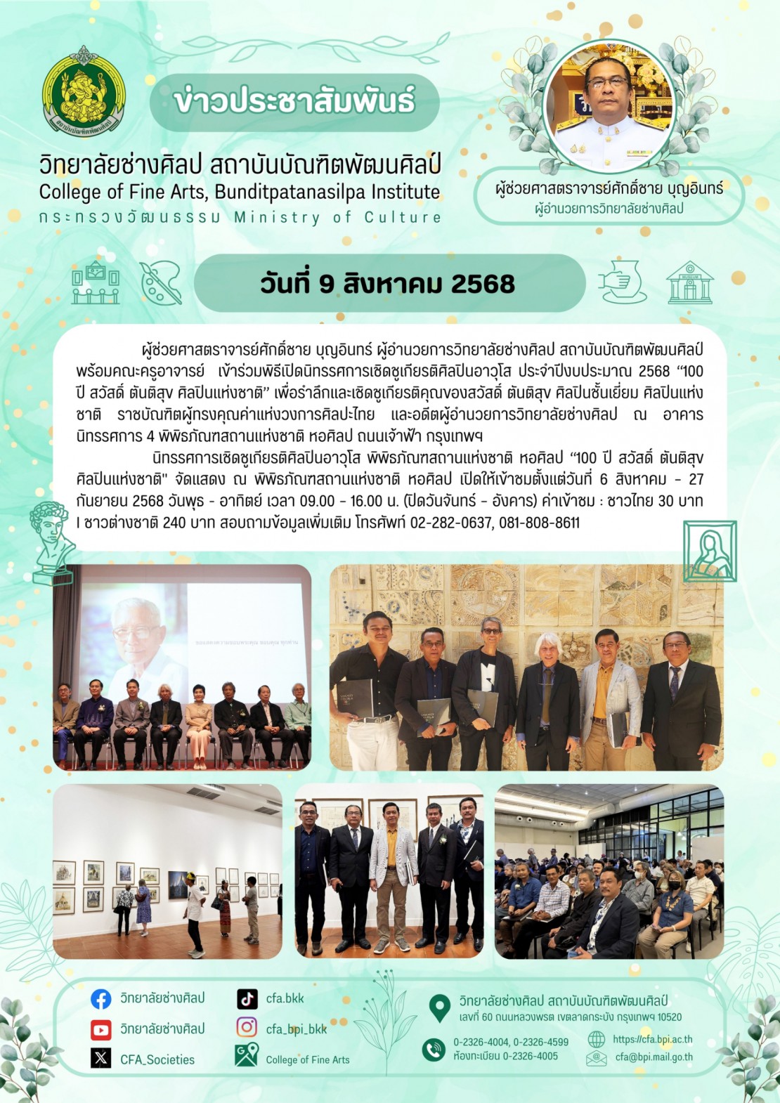 ✨ วันที่ 9 สิงหาคม 2568 เวลา 10:30 น. ผู้ช่วยศาสตราจารย์ศักดิ์ชาย บุญอินทร์ ผู้อำนวยการวิทยาลัยช่างศิลป สถาบันบัณฑิตพัฒนศิลป์ พร้อมคณะครูอาจารย์ 🎉 เข้าร่วมพิธีเปิดนิทรรศการเชิดชูเกียรติศิลปินอาวุโส ประจำปีงบประมาณ 2568 🎨“100 ปี สวัสดิ์ ตันติสุข ศิลปินแห่งชาติ”🖼️ เพื่อรำลึกและเชิดชูเกียรติคุณของสวัสดิ์ ตันติสุข ศิลปินชั้นเยี่ยม ศิลปินแห่งชาติ ราชบัณฑิตผู้ทรงคุณค่าแห่งวงการศิลปะไทย และอดีตผู้อำนวยการวิทยาลัยช่างศิลป🖌️ ณ อาคารนิทรรศการ 4 พิพิธภัณฑสถานแห่งชาติ หอศิลป ถนนเจ้าฟ้า กรุงเทพฯ ✨