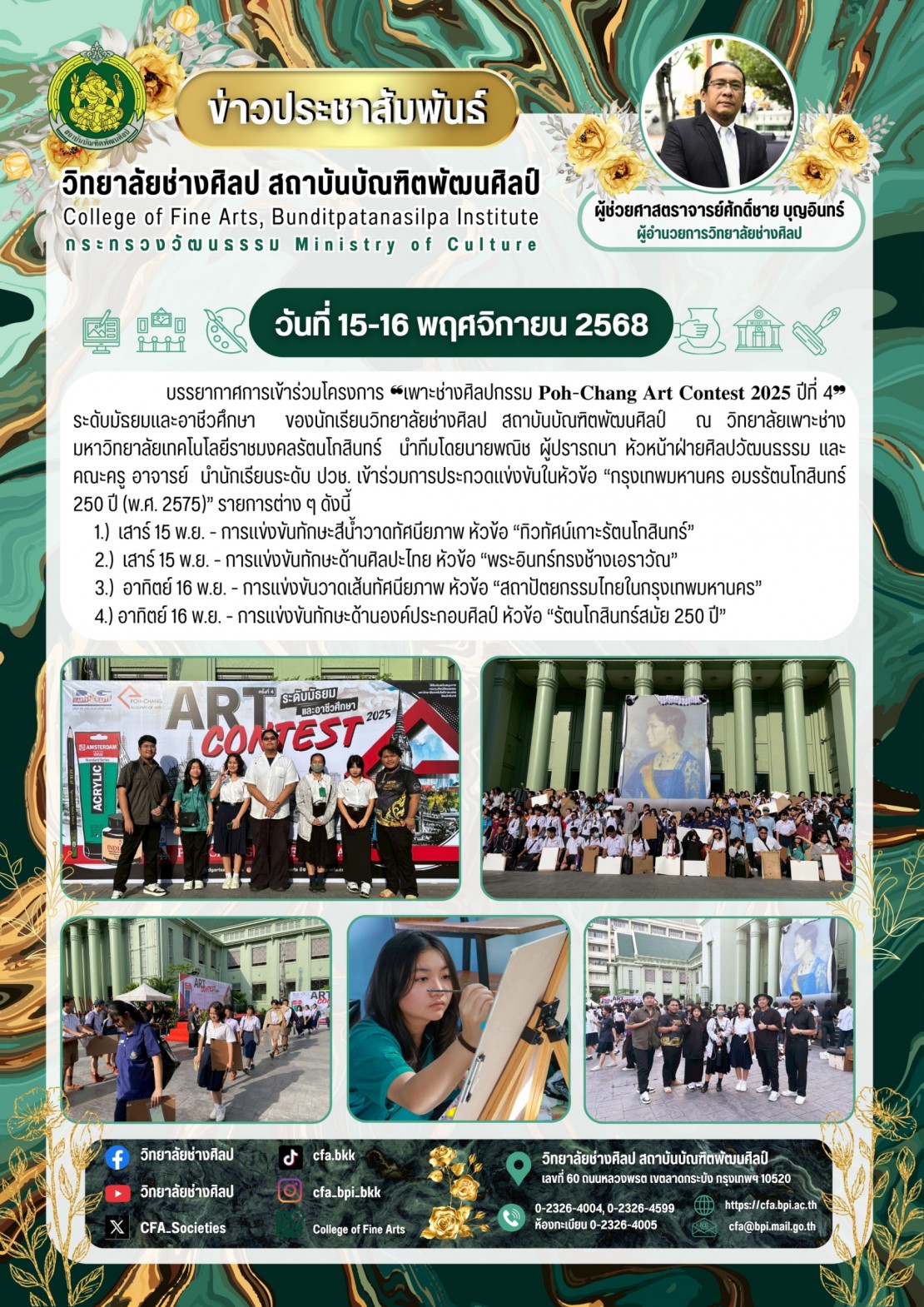 วิทยาลัยช่างศิลป ร่วมโครงการ ❝เพาะช่างศิลปกรรม 𝐏𝐨𝐡-𝐂𝐡𝐚𝐧𝐠 𝐀𝐫𝐭 𝐂𝐨𝐧𝐭𝐞𝐬𝐭 𝟐𝟎𝟐𝟓  ปีที่ 4❞ ณ วิทยาลัยเพาะช่าง มหาวิทยาลัยเทคโนโลยีราชมงคลรัตนโกสินทร์