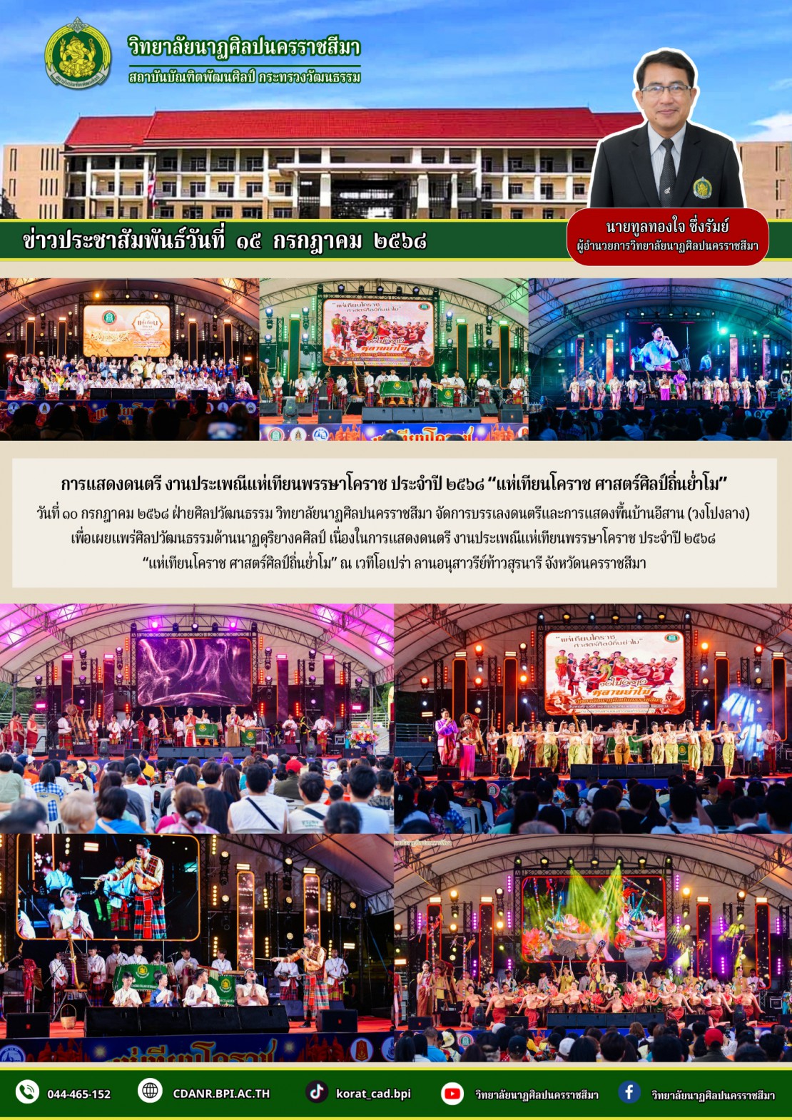 วิทยาลัยนาฏศิลปนครราชสีมา จัดการบรรเลงดนตรีและการแสดงพื้นบ้านอีสาน งานประเพณีแห่เทียนพรรษาโคราช ประจำปี ๒๕๖๘ “แห่เทียนโคราช ศาสตร์ศิลป์ถิ่นย่ำโม”