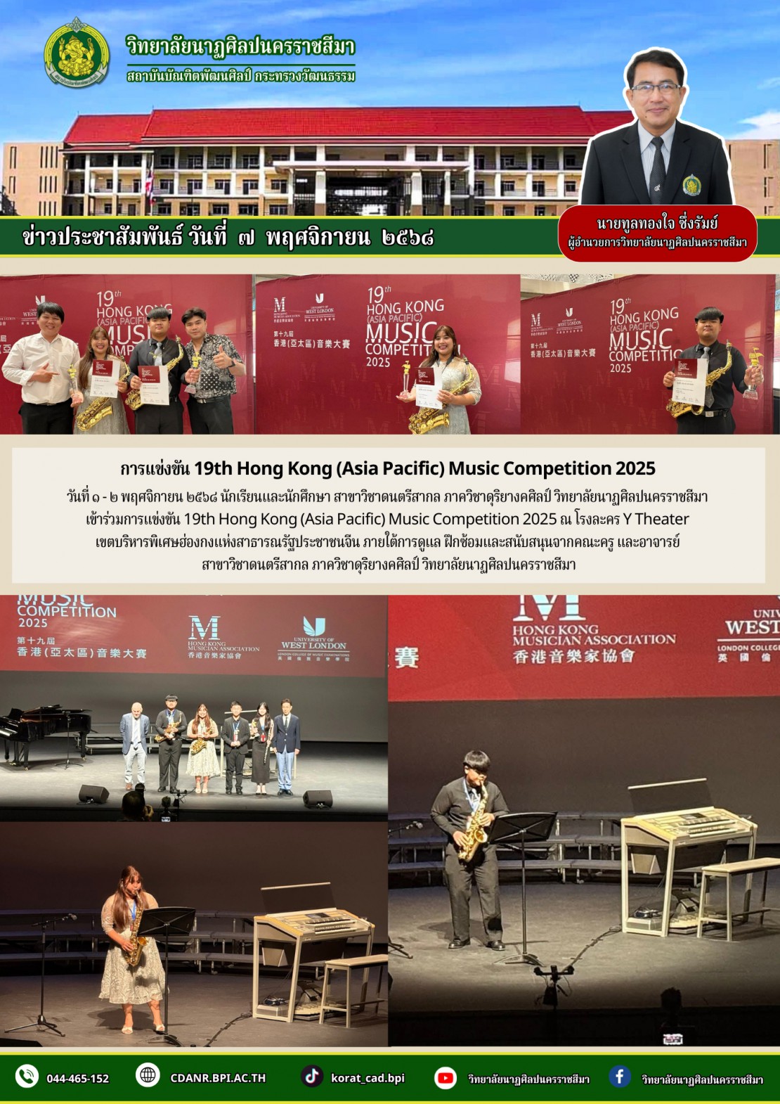 วันที่ ๑ - ๒ พฤศจิกายน ๒๕๖๘ นักเรียนเเละนักศึกษา สาขาวิชาดนตรีสากล ภาควิชาดุริยางคศิลป์ วิทยาลัยนาฏศิลปนครราชสีมา เข้าร่วมการแข่งขัน 19th Hong Kong (Asia Pacific) Music Competition 2025 ณ โรงละคร Y Theater เขตบริหารพิเศษฮ่องกงแห่งสาธารณรัฐประชาชนจีน ภายใต้การดูแล ฝึกซ้อมและสนับสนุนจากคณะครู และอาจารย์ สาขาวิชาดนตรีสากล ภาควิชาดุริยางคศิลป์ วิทยาลัยนาฏศิลปนครราชสีม