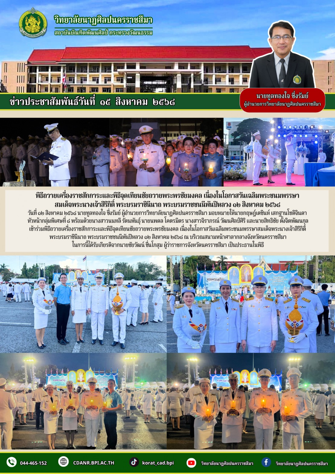 วันที่ ๑๒ สิงหาคม ๒๕๖๘ นายทูลทองใจ ซึ่งรัมย์ ผู้อำนวยการวิทยาลัยนาฏศิลปนครราชสีมา มอบหมายให้นายกฤษฎ์เตชินห์ เสกฐานโชติจินดา หัวหน้ากลุ่มพิเศษที่ ๘ พร้อมด้วยนางสาวนนทลี รัตนพันธุ์ นายนพดล โคตรมิตร นางสาวจิราภรณ์ วัฒนศิลป์ศิริ และนายสิทธิชัย ตั้งจิตพัฒนกุล เข้าร่วมพิธีถวายเครื่องราชสักการะและพิธีจุดเทียนชัยถวายพระพรชัยมงคล เนื่องในโอกาสวันเฉลิมพระชนมพรรษาสมเด็จพระนางเจ้าสิริกิติ์ พระบรมราชินีนาถ พระบรมราชชนนีพันปีหลวง ๑๒ สิงหาคม ๒๕๖๘ ณ บริเวณสนามหน้าศาลากลางจังหวัดนครราชสีมา ในการนี้ได้รับเกียรติจากนายชัยวัฒน์ ชื่นโกสุม ผู้ว่าราชการจังหวัดนครราชสีมา เป็นประธานในพิธี