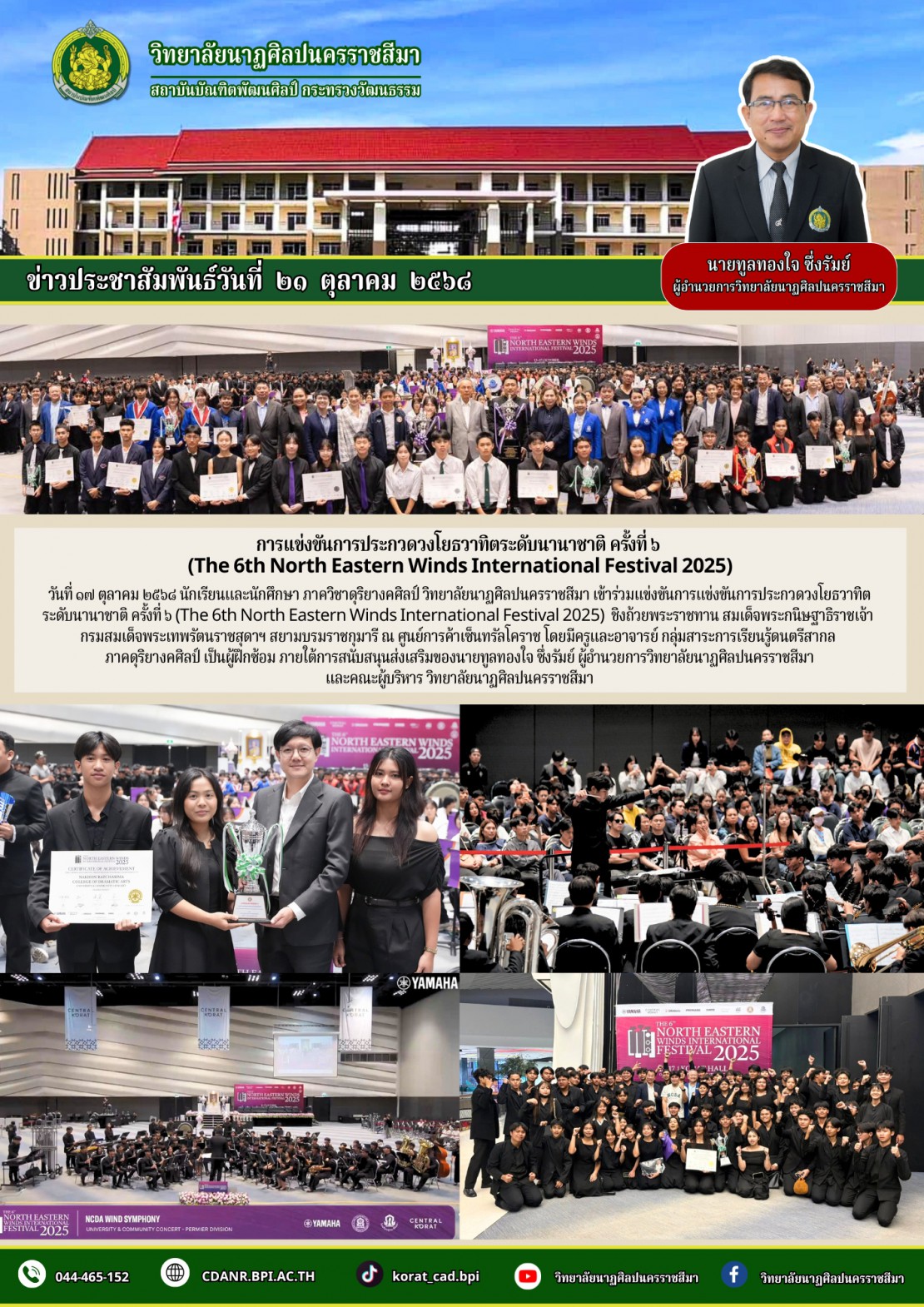 วันที่ ๑๗ ตุลาคม ๒๕๖๘ นักเรียนเเละนักศึกษา ภาควิชาดุริยางคศิลป์ วิทยาลัยนาฏศิลปนครราชสีมา เข้าร่วมแข่งขันการแข่งขันการประกวดวงโยธวาทิตระดับนานาชาติ ครั้งที่ ๖ (The 6th North Eastern Winds International Festival 2025)  ชิงถ้วยพระราชทาน สมเด็จพระกนิษฐาธิราชเจ้า กรมสมเด็จพระเทพรัตนราชสุดาฯ สยามบรมราชกุมารี ณ ศูนย์การค้าเซ็นทรัลโคราช โดยมีครูและอาจารย์ กลุ่มสาระการเรียนรู้ดนตรีสากล ภาคดุริยางคศิลป์ เป็นผู้ฝึกซ้อม ภายใต้การสนับสนุนส่งเสริมของนายทูลทองใจ ซึ่งรัมย์ ผู้อำนวยการวิทยาลัยนาฏศิลปนครราชสีมาและคณะผู้บริหาร วิทยาลัยนาฏศิลปนครราชสีมา