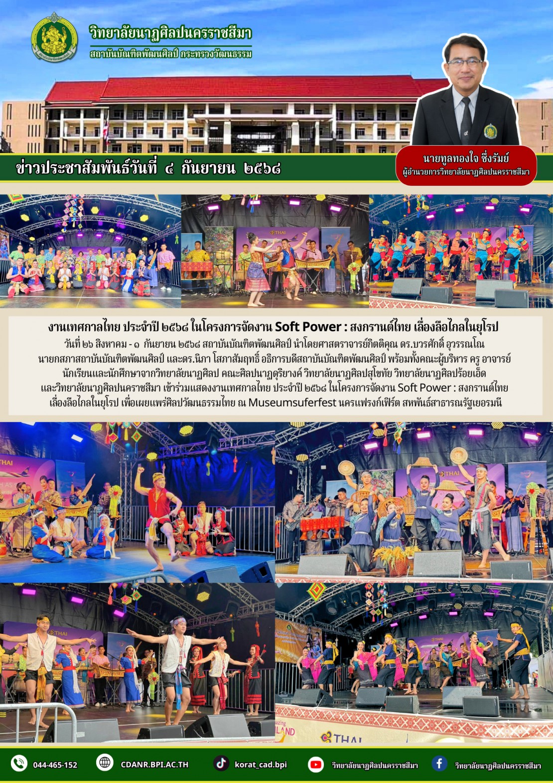 วันที่ ๒๖ สิงหาคม - ๑ กันยายน ๒๕๖๘ สถาบันบัณฑิตพัฒนศิลป์ นำโดยศาสตราจารย์กิตติคุณ ดร.บวรศักดิ์ อุวรรณโณ นายกสภาสถาบันบัณฑิตพัฒนศิลป์ และดร.นิภา โสภาสัมฤทธิ์ อธิการบดีสถาบันบัณฑิตพัฒนศิลป์ พร้อมทั้งคณะผู้บริหาร ครู อาจารย์ นักเรียนและนักศึกษาจากวิทยาลัยนาฏศิลป คณะศิลปนาฏดุริยางค์ วิทยาลัยนาฏศิลปสุโขทัย วิทยาลัยนาฏศิลปร้อยเอ็ด และวิทยาลัยนาฏศิลปนครราชสีมา เข้าร่วมแสดงงานเทศกาลไทย ประจำปี ๒๕๖๘ ในโครงการจัดงาน Soft Power : สงกรานต์ไทย เลื่องลือไกลในยุโรป เพื่อเผยแพร่ศิลปวัฒนธรรมไทย ณ Museumsuferfest นครแฟรงก์เฟิร์ต สหพันธ์สาธารณรัฐเยอรมนี