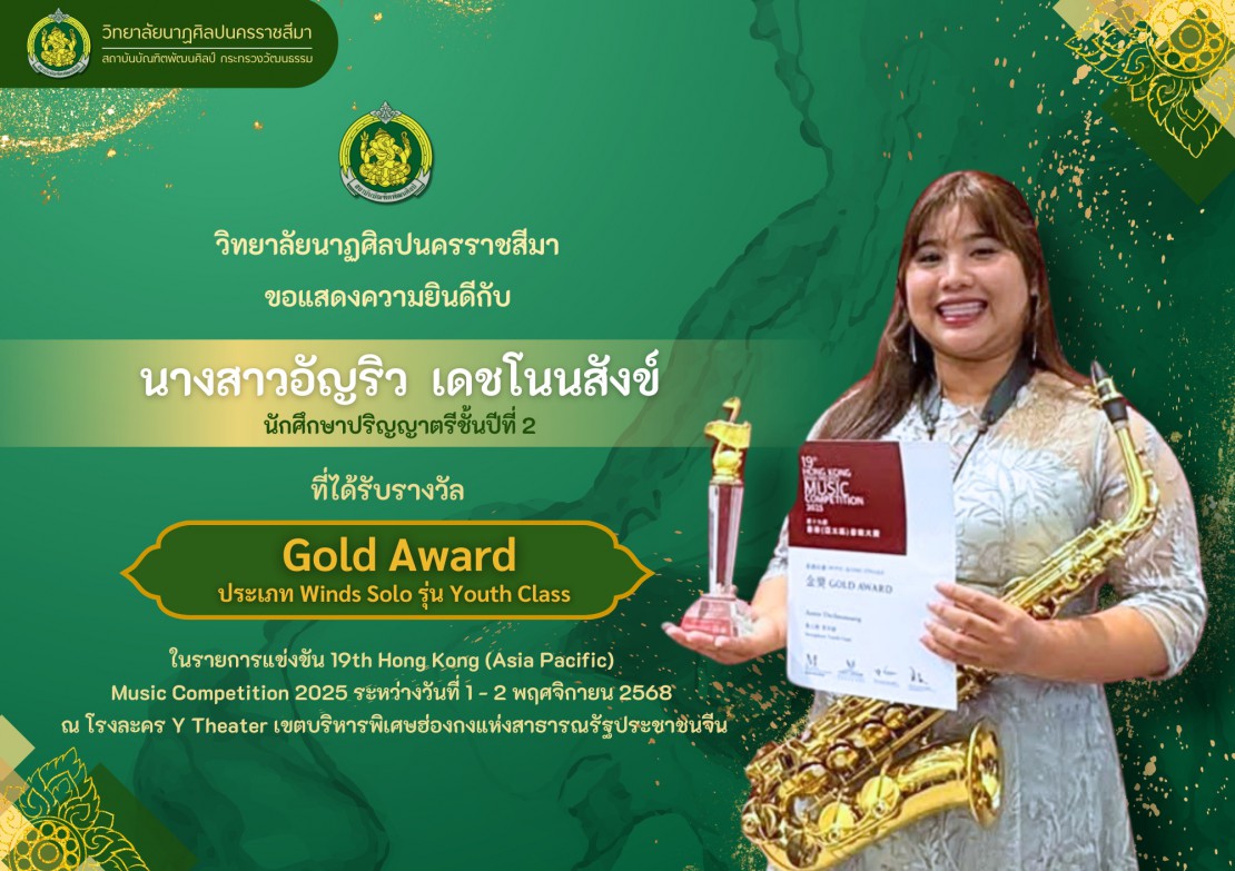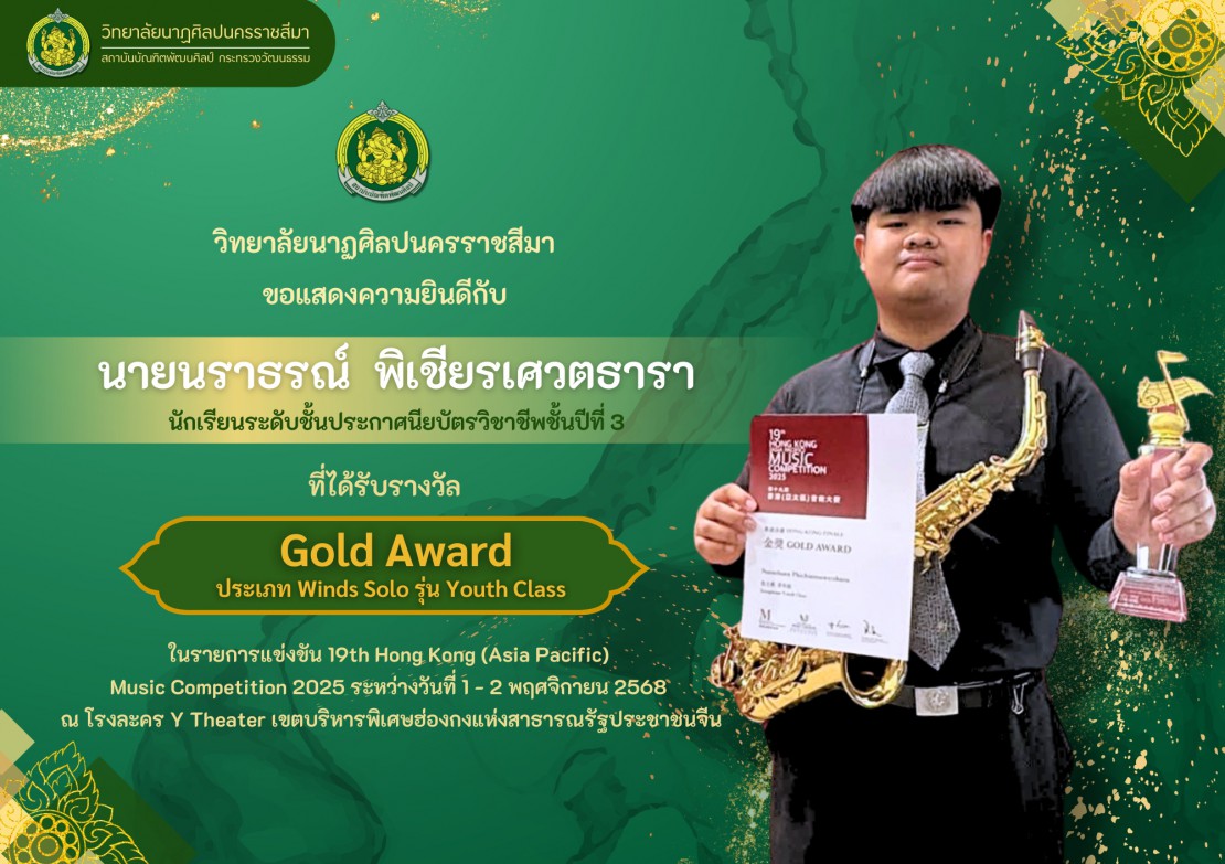ขอแสดงความยินดีกับนักเรียนและนักศึกษาวิทยาลัยนาฏศิลปนครราชสีมา ที่ได้รับรางวัล Gold Award ประเภท Winds Solo รุ่น Youth Class ดังนี้