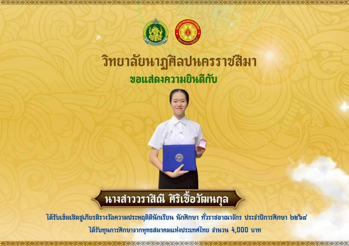 วิทยาลัยนาฏศิลปนครราชสีมา แสดงความยินดีกับ  นางสาววราสิณี ศิริเชื้อวัฒนกุล ได้รับเข็มเชิดชูเกียรติรางวัลความประพฤติดีนักเรียน นักศึกษา ทั่วราชอาณาจักร ประจำปีการศึกษา ๒๕๖๘