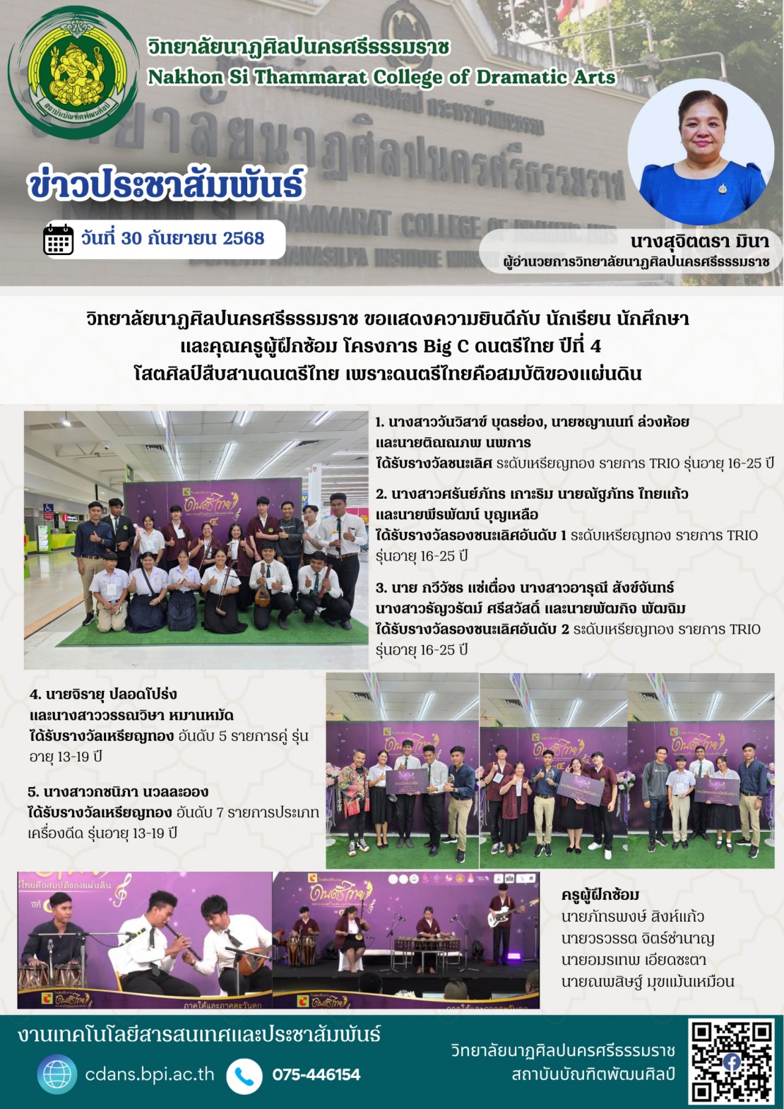 วิทยาลัยนาฏศิลปนครศรีธรรมราช แสดงความยินดีกับ นักเรียน นักศึกษา และคุณครูผู้ฝึกซ้อม โครงการ Big C ดนตรีไทย ปีที่ 4