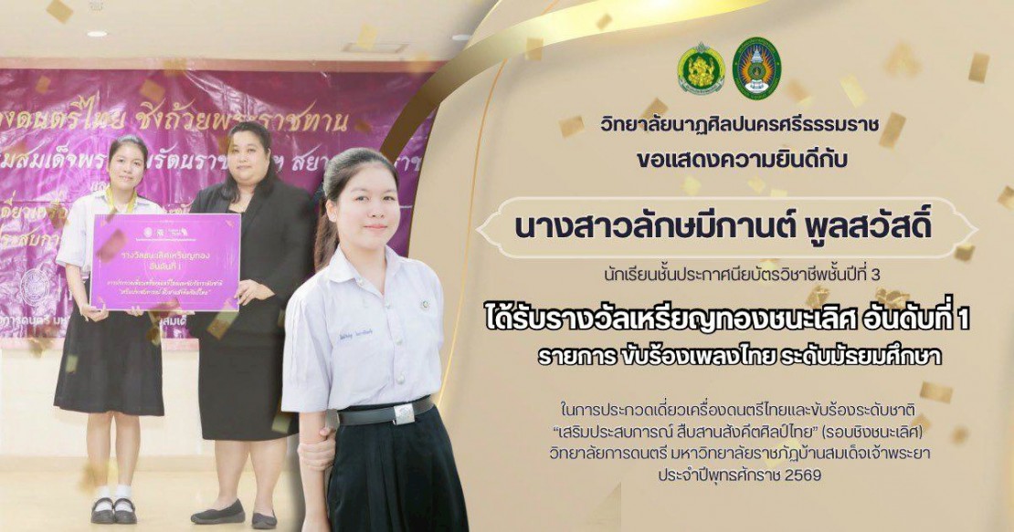 วิทยาลัยนาฏศิลปนครศรีธรรมราช ขอแสดงความยินดีและชื่นชมแก่ นักเรียน คณะครูผู้ควบคุม ที่ได้เข้าร่วม การประกวดเดี่ยวเครื่องดนตรีไทยและขับร้องระดับชาติ "เสริมประสบการณ์ สืบสานสังคีตศิลป์ไทย" (รอบชิงชนะเลิศ) งานวันคล้ายวันพิราลัยสมเด็จเจ้าพระยาบรมมหาศรีสุริยวงศ์ (ช่วง บุนนาค) ประจำปีพุทธศักราช 2569 ณ วิทยาลัยการดนตรี มหาวิทยาลัยราชภัฏบ้านสมเด็จเจ้าพระยา ในวันที่ 15 มกราคม 2569 ที่ผ่านมา