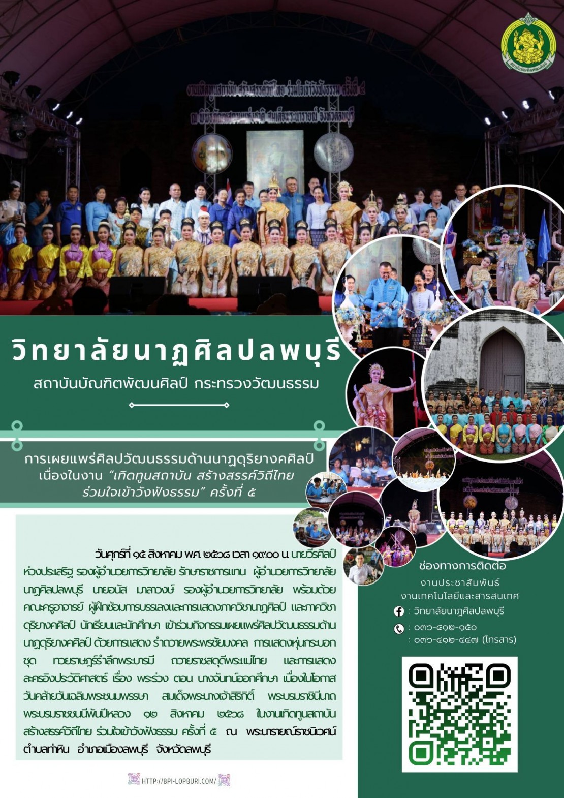 วันศุกร์ที่ ๑๕ สิงหาคม พ.ศ. ๒๕๖๘ เวลา ๑๙.๐๐ น. นายวีรศิลป์ ห่วงประเสริฐ รองผู้อำนวยการวิทยาลัย รักษาราชการแทน ผู้อำนวยการวิทยาลัยนาฏศิลปลพบุรี นายอนัส มาลาวงษ์ รองผู้อำนวยการวิทยาลัย พร้อมด้วย คณะครูอาจารย์ ผู้ฝึกซ้อมการบรรเลงและการแสดงภาควิชานาฏศิลป์ และภาควิชาดุริยางคศิลป์ นักเรียนและนักศึกษา เข้าร่วมกิจกรรมเผยแพร่ศิลปวัฒนธรรมด้านนาฏดุริยางคศิลป์ ด้วยการแสดง รำถวายพระพรชัยมงคล การแสดงหุ่นกระบอก ชุด ทวยราษฎร์รำลึกพระบารมี ถวายราชสดุดีพระแม่ไทย และการแสดง ละครอิงประวัติศาสตร์ เรื่อง พระร่วง ตอน นางจันทน์ออกศึกษา เนื่องในโอกาส วันคล้ายวันเฉลิมพระชนมพรรษา สมเด็จพระนางเจ้าสิริกิติ์ พระบรมราชินีนาถ พระบรมราชชนนีพันปีหลวง ๑๒ สิงหาคม ๒๕๖๘ ในงานเทิดทูนสถาบัน สร้างสรรค์วิถีไทย ร่วมใจเข้าวังฟังธรรม ครั้งที่ ๕ ณ พระนารายณ์ราชนิเวศน์ ตำบลท่าหิน อำเภอเมืองลพบุรี จังหวัดลพบุรี