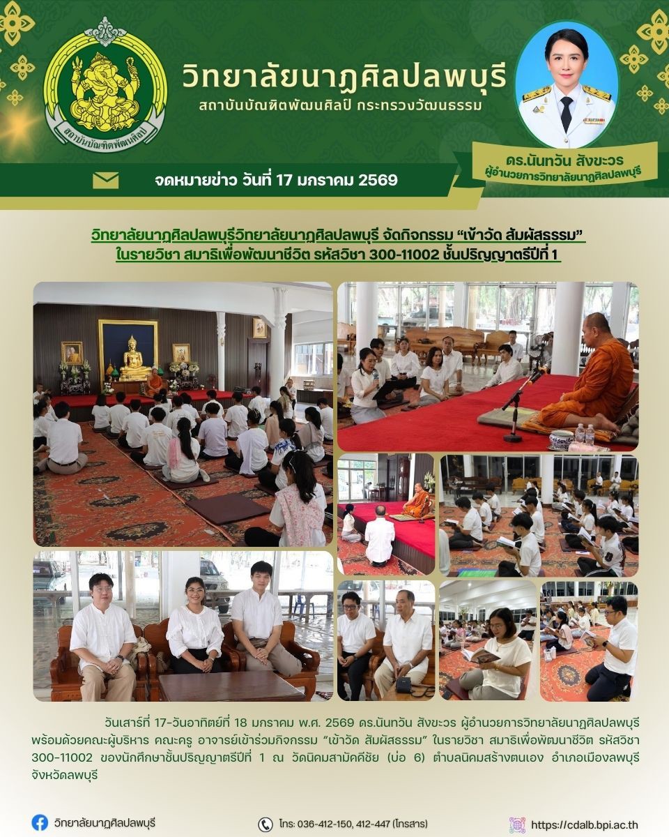 วิทยาลัยนาฏศิลปลพบุรี จัดกิจกรรม “เข้าวัด สัมผัสธรรม” ในรายวิชา สมาธิเพื่อพัฒนาชีวิต รหัสวิชา 300-11002 ชั้นปริญญาตรีปีที่ 1 วันที่ 17-18 มกราคม 2569 ณ วัดนิคมสามัคคีชัย (บ่อ 6) จังหวัดลพบุรี