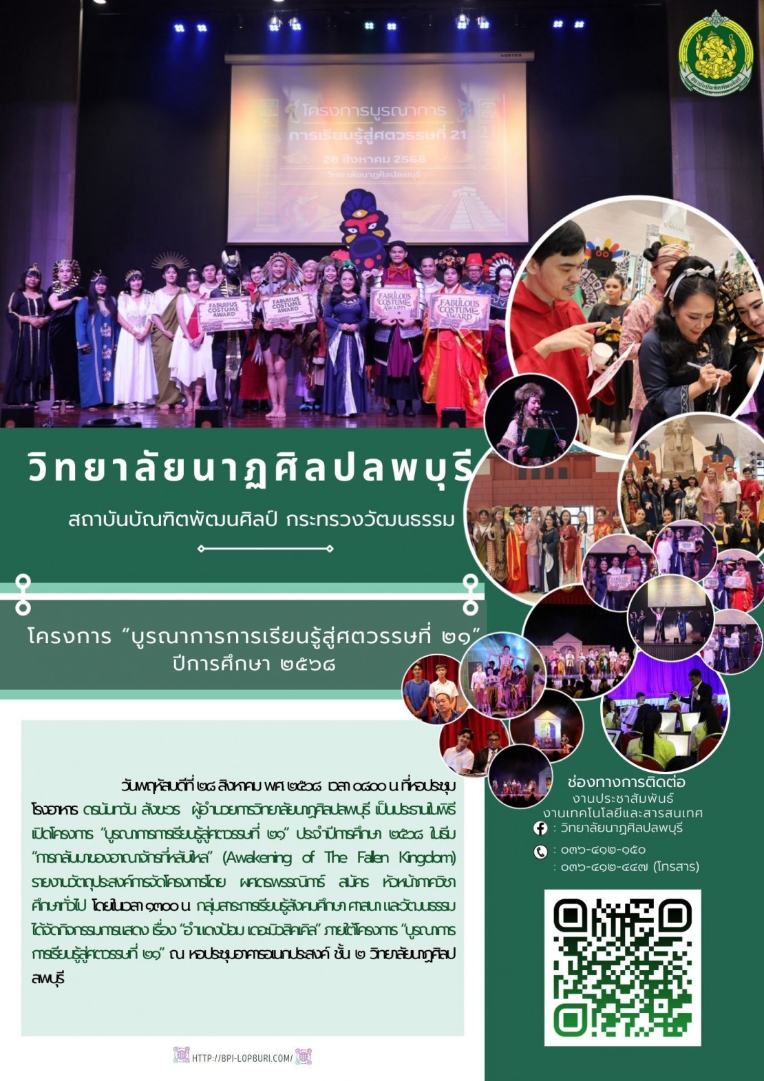 วันพฤหัสบดีที่ ๒๘ สิงหาคม พ.ศ. ๒๕๖๘  เวลา ๐๘.๐๐ น. ที่หอประชุม     โรงอาหาร ดร.นันทวัน สังขะวร  ผู้อำนวยการวิทยาลัยนาฏศิลปลพบุรี เป็นประธานในพิธีเปิดโครงการ “บูรณาการการเรียนรู้สู่ศตวรรษที่ ๒๑” ประจำปีการศึกษา ๒๕๖๘ ในธีม “การกลับมาของอาณาจักรที่หลับใหล” (Awakening of The Fallen Kingdom)       รายงานวัตถุประสงค์การจัดโครงการโดย ผศ.ดร.พรรณิการ์ สมัคร หัวหน้าภาควิชา      ศึกษาทั่วไป  โดยในเวลา ๑๓.๐๐ น.  กลุ่มสาระการเรียนรู้สังคมศึกษา ศาสนา และวัฒนธรรม ได้จัดกิจกรรมการแสดง เรื่อง “อำแดงป้อม เดอะมิวสิคเคิล” ภายใต้โครงการ “บูรณาการการเรียนรู้สู่ศตวรรษที่ ๒๑” ณ หอประชุมอาคารอเนกประสงค์ ชั้น ๒ วิทยาลัยนาฏศิลปลพบุรี