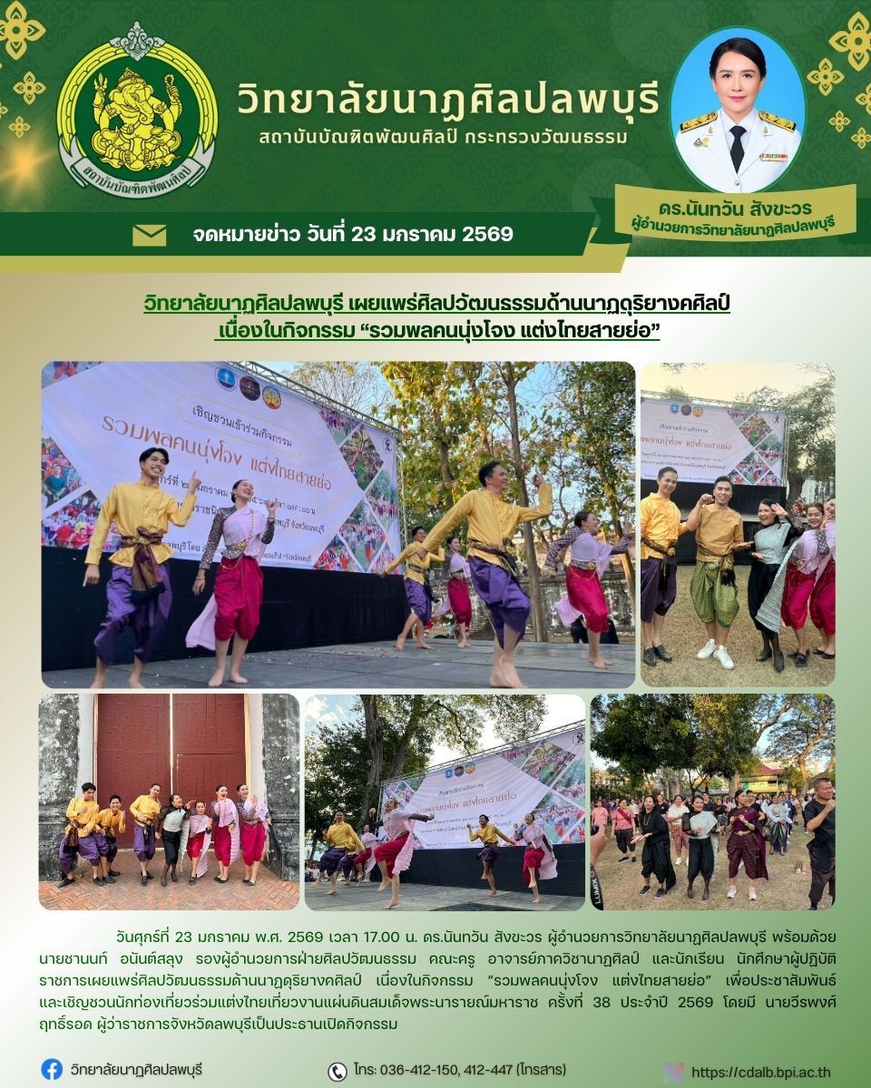 วิทยาลัยนาฏศิลปลพบุรี ดำเนินการเผยแพร่ศิลปวัฒนธรรมด้านนาฏดุริยางคศิลป์ เนื่องในกิจกรรม “รวมพลคนนุ่งโจง แต่งไทยสายย่อ” วันที่ 23 มกราคม พ.ศ. 2569 ณ พระนารายณ์ราชนิเวศน์ จังหวัดลพบุรี