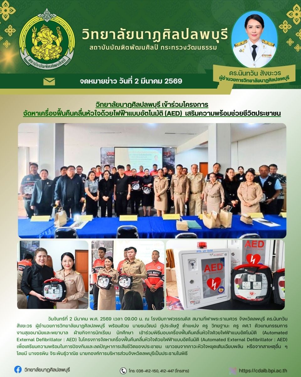 วิทยาลัยนาฏศิลปลพบุรี โดย ดร.นันทวัน สังขะวร ผู้อำนวยการ พร้อมด้วย ตัวแทนงานสุขอนามัยและพยาบาล ฝ่ายกิจการนักเรียน นักศึกษา เข้าร่วมโครงการจัดหาเครื่องฟื้นคืนคลื่นหัวใจด้วยไฟฟ้าแบบอัตโนมัติ (Automated External Defibrillator : AED) เสริมความพร้อมช่วยชีวิตประชาชน เพื่อเตรียมความพร้อมในการป้องกันและลดปัญหาการเสียชีวิตของประชาชน เยาวชน จากภาวะหัวใจหยุดเต้นเฉียบพลันหรือจากสาเหตุอื่น ๆ วันที่ 2 มีนาคม พ.ศ. 2569 ณ โรงยิมกาฬวรรณดิส สนามกีฬาพระราเมศวร จังหวัดลพบุรี
