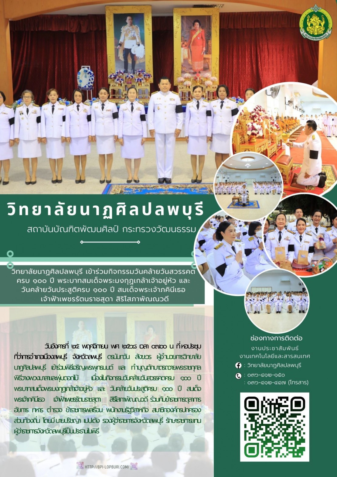 วิทยาลัยนาฏศิลปลพบุรี ร่วมพิธีเจริญพระพุทธมนต์ และ ทำบุญตักบาตรถวายพระราชกุศล ในกิจกรรมวันคล้ายวันสวรรคตครบ ๑๐๐ ปี พระบาทสมเด็จพระมงกุฏเกล้าเจ้าอยู่หัว และ วันคล้ายวันประสูติครบ ๑๐๐ ปี สมเด็จพระเจ้าภคินีเธอ เจ้าฟ้าเพชรรัตนราชสุดา สิริโสภาพัณณวดี
