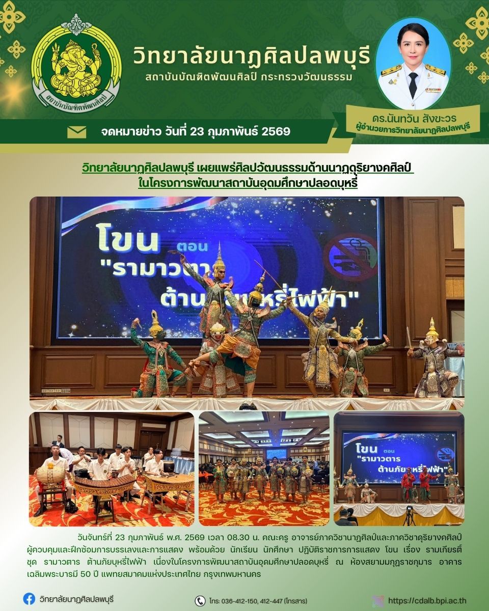 วิทยาลัยนาฏศิลปลพบุรี เผยแพร่ศิลปวัฒนธรรมด้านนาฏดุริยางคศิลป์เนื่องในโครงการพัฒนาสถาบันอุดมศึกษาปลอดบุหรี่ วันที่ 23 กุมภาพันธ์ 2569 ณ ห้องสยามมกุฏราชกุมาร อาคารเฉลิมพระบารมี 50 ปี แพทยสมาคมแห่งประเทศไทย กรุงเทพมหานคร