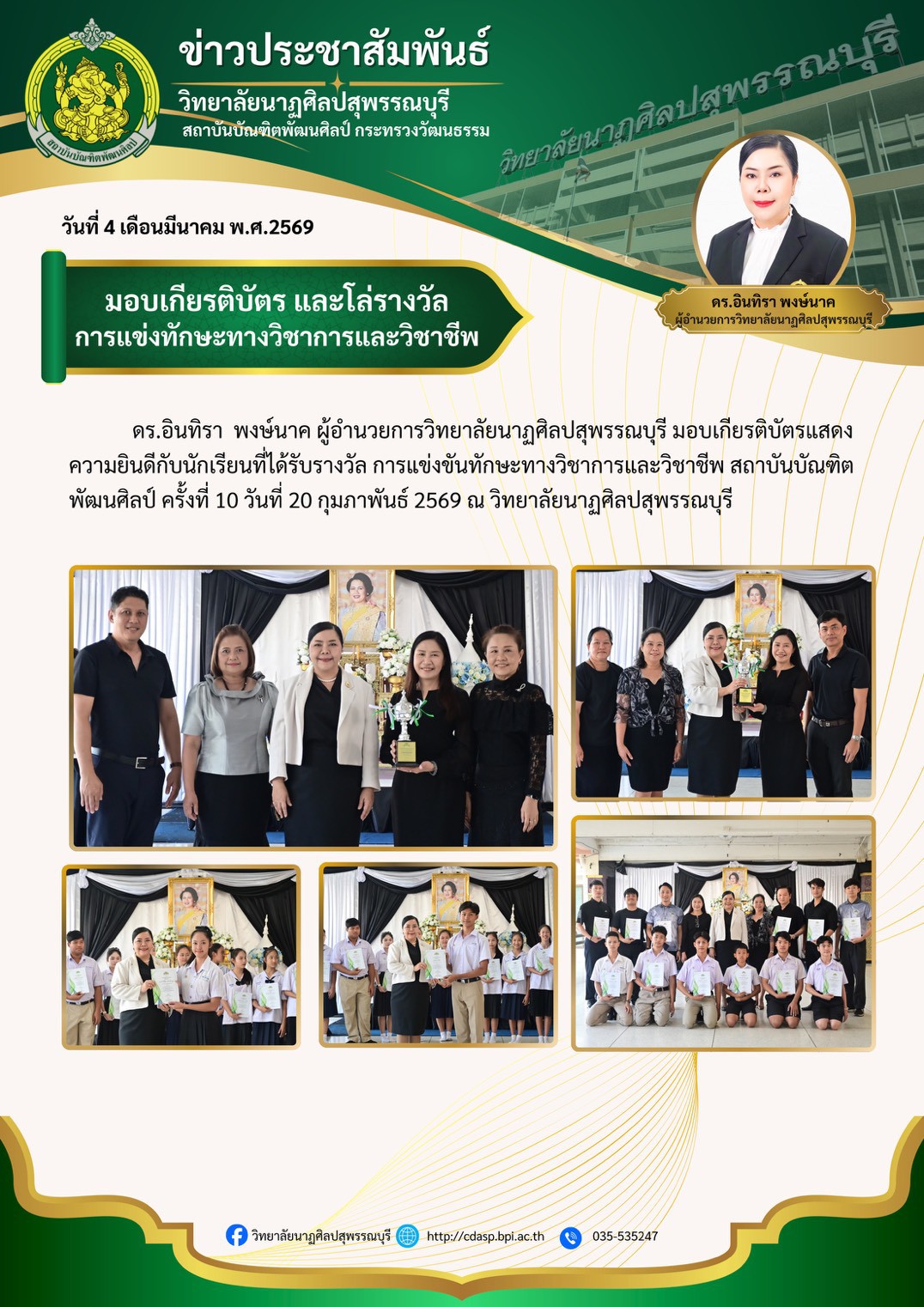 วิทยาลัยนาฏศิลปสุพรรณบุรี โดย ดร.อินทิรา พงษ์นาค ผู้อำนวยการวิทยาลัยนาฏศิลปสุพรรณบุรี มอบเกียรติบัตรให้กับนักเรียนที่ได้รับรางวัลในการแข่งขันทักษะทางวิชาการและวิชาชีพ สถาบันบัณฑิตพัฒนศิลป์ ครั้งที่ 10 ปีการศึกษา 2568 👇ลิ้งค์ภาพความประทับใจ