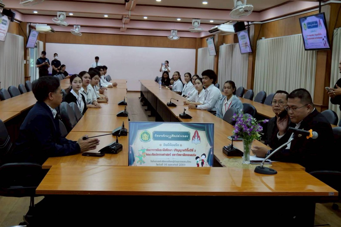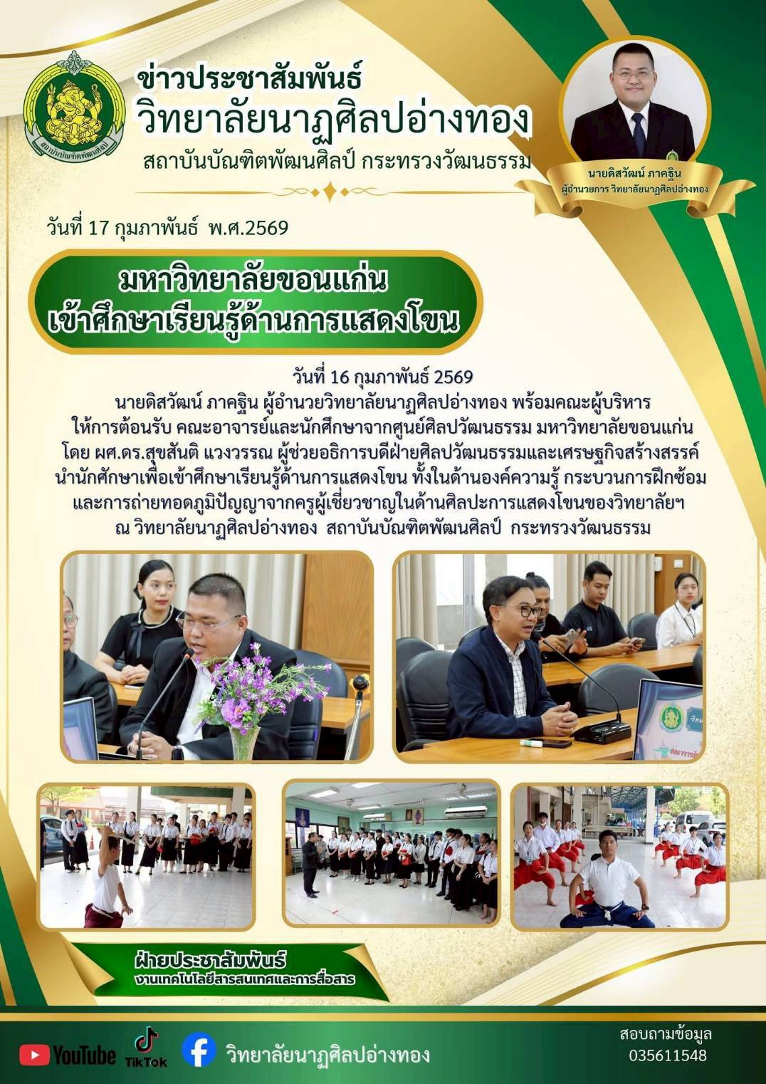 วันที่ 16 กุมภาพันธ์ 2569 นายดิสวัฒน์ ภาคฐิน ผู้อำนวยวิทยาลัยนาฏศิลปอ่างทอง พร้อมคณะผู้บริหาร ให้การต้อนรับ คณะอาจารย์และนักศึกษาจากศูนย์ศิลปวัฒนธรรม มหาวิทยาลัยขอนแก่น โดย ผศ.ดร.สุขสันติ แวงวรรณ ผู้ช่วยอธิการบดีฝ่ายศิลปวัฒนธรรมและเศรษฐกิจสร้างสรรค์ นำนักศักษาเพื่อเข้าศึกษาเรียนรู้ด้านการแสดงโขน ทั้งในด้านองค์ความรู้ กระบวนการฝึกซ้อม และการถ่ายทอดภูมิปัญญาจากครูผู้เชี่ยวชาญในด้านศิลปะการแสดงโขนของวิทยาลัยฯ ณ วิทยาลัยนาฏศิลปอ่างทอง สถาบันบัณฑิตพัฒนศิลป์ กระทรวงวัฒนธรรม