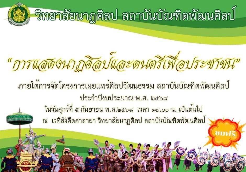 วิทยาลัยนาฏศิลป ขอเชิญชมการแสดงนาฏศิลป์และดนตรีเพื่อประชาชน ภายใต้การจัดโครงการเผยแพร่ศิลปวัฒนธรรม