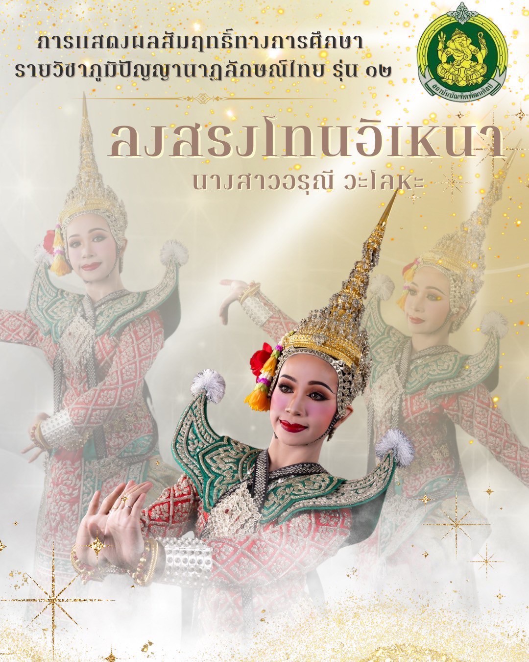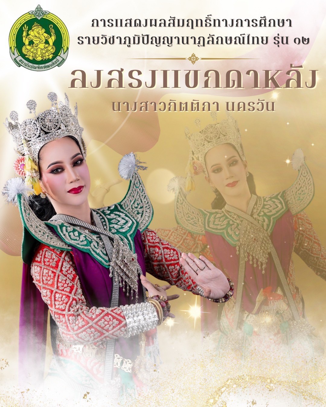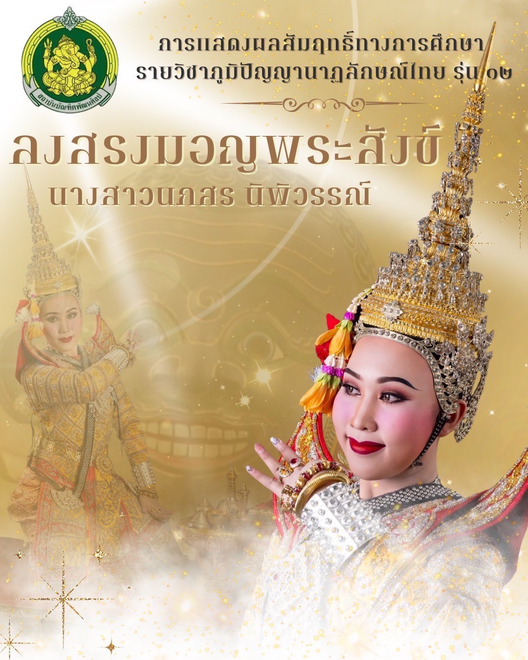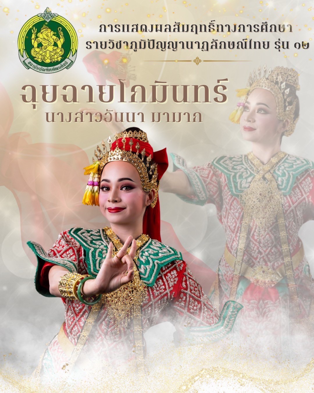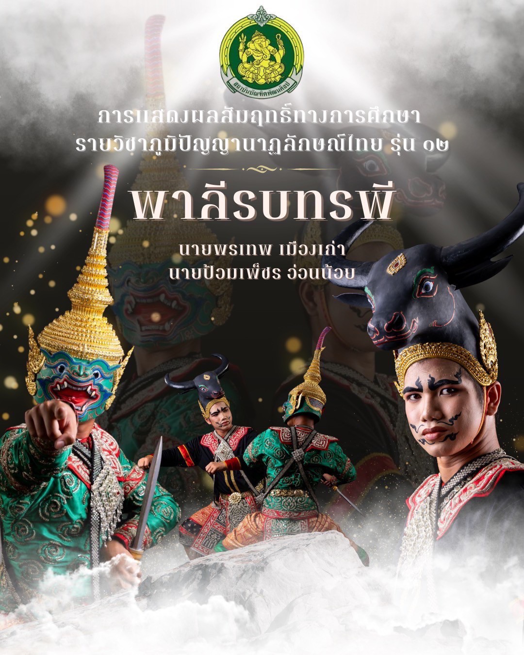 วิทยาลัยนาฏศิลป ขอเชิญชม การแสดงผลสัมฤทธิ์ทางการศึกษา รายวิชา ภูมิปัญญานาฏลักษณ์ไทย ของนักศึกษาระดับชั้นปริญญาตรีปีที่ 4 รุ่นที่ 12