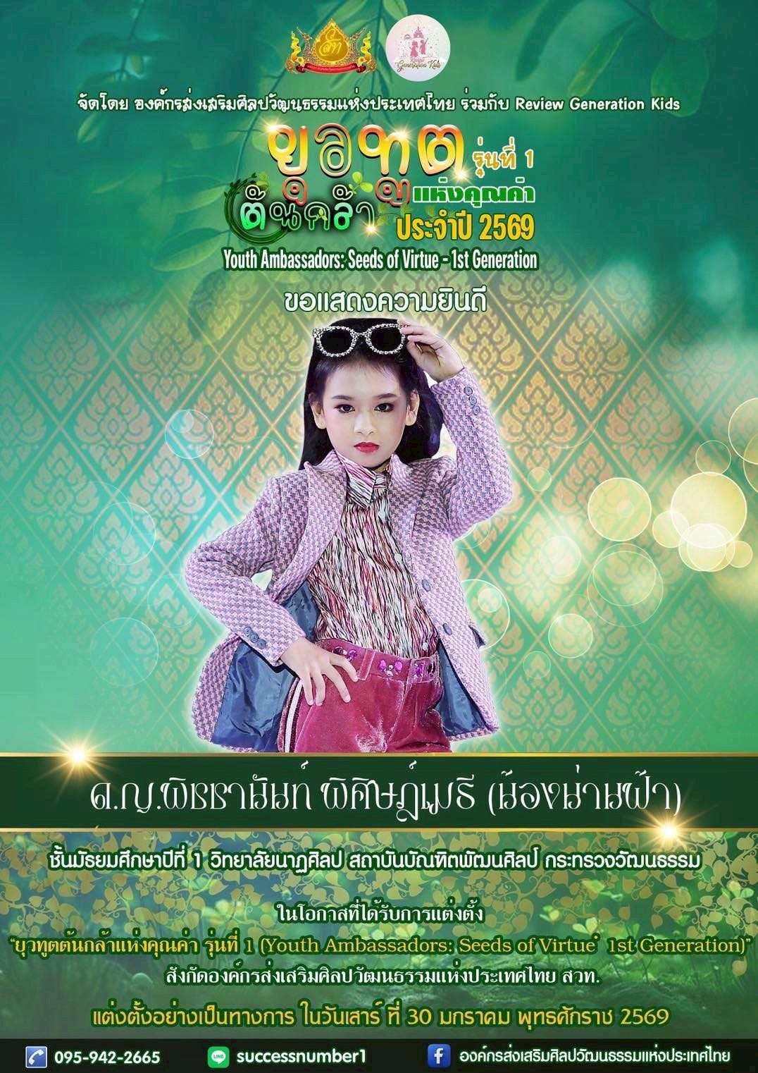วิทยาลัยนาฏศิลป แสดงความยินดีกับด.ญ.พิชชานันท์  พิศิษฏ์เมธี ได้รับคำเลือกเป็นยุวทูตต้นกล้าแห่งคุณค่า รุ่นที่ 1
