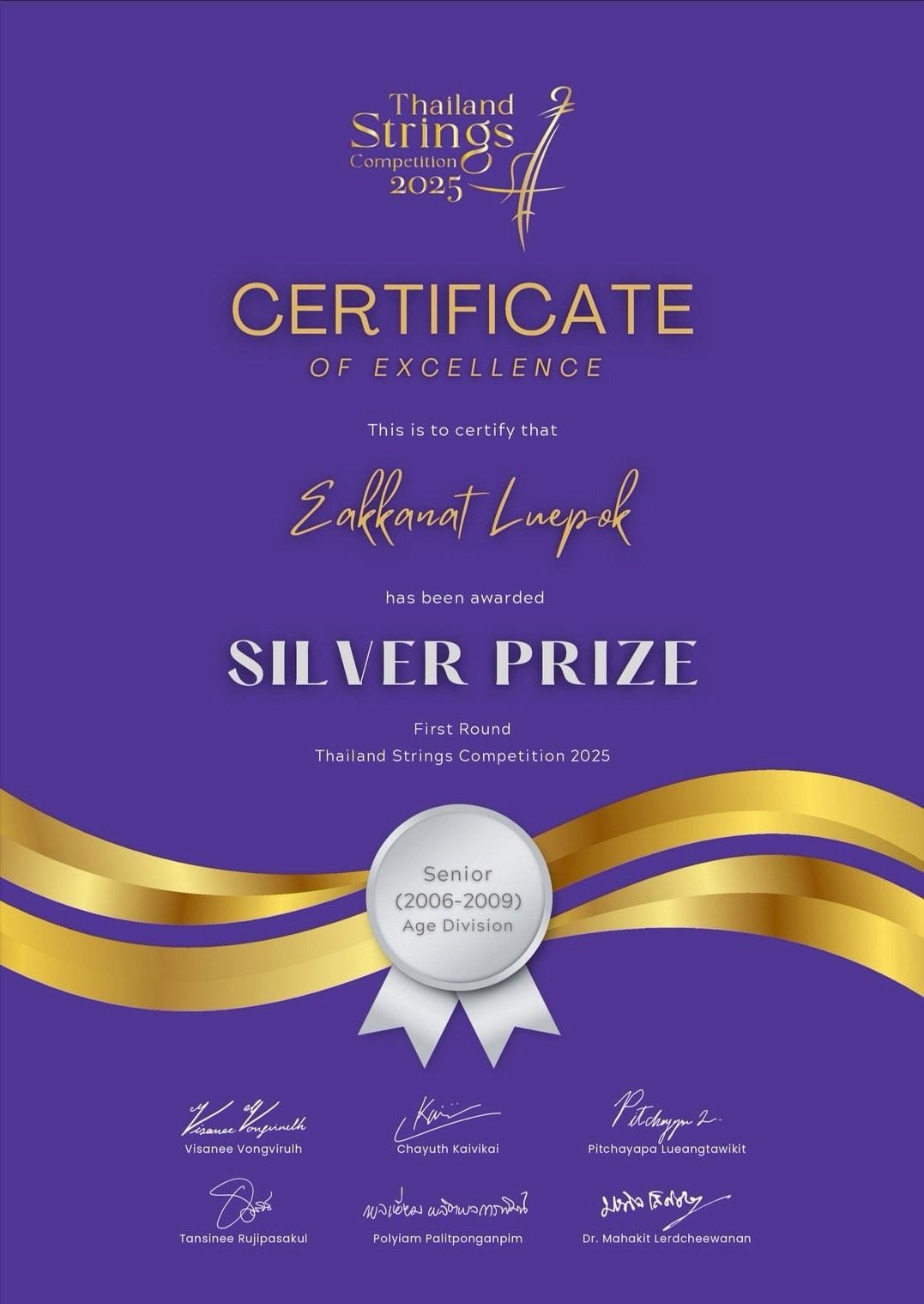 วิทยาลัยนาฏศิลป แสดงความยินดีกับนายเอกณัฏฐ์ ลือพอก ได้รับรางวัลเหรียญเงินในการแข่งขัน Thailand String Competition 2025