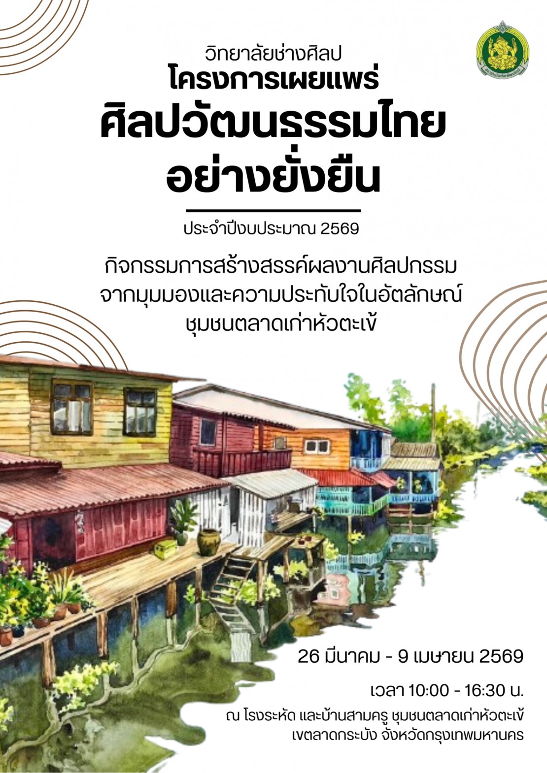 🌞 เข้าสู่ช่วงพักผ่อนฤดูร้อนกันแล้ว 😎🏖️ หากท่านใดมีโอกาสมาเที่ยวชม #ตลาดเก่าโบราณหัวตะเข้ 🛶 อย่าลืม! แวะชมผลงานศิลปะจาก #ช่างศิลปลาดกระบัง ได้ที่ #โรงระหัด และ #บ้านสามครู ถึงวันที่ 9 เม.ย.เท่านั้นนะคะ! 🎨 นิทรรศการโครงการเผยแพร่ศิลปวัฒนธรรมไทยอย่างยั่งยืน ประจำปีงบประมาณ 2569 กิจกรรมการสร้างสรรค์ผลงานศิลปกรรม 🛖“มุมมองและความประทับใจในอัตลักษณ์ชุมชนตลาดเก่าหัวตะเข้”🐊 จัดแสดงตั้งแต่วันที่ 26 มีนาคม - 9 เมษายน 2569 เปิดให้เข้าชมทุกวัน เวลา 10:00-16:30 น. 📍 ณ โรงระหัดและบ้านสามครู ภายในชุมชนตลาดเก่าหัวตะเข้ เขตลาดกระบัง กรุงเทพฯ 🖼️ มาชมกันเยอะ ๆ ค่าา 😘🫰🫶💚